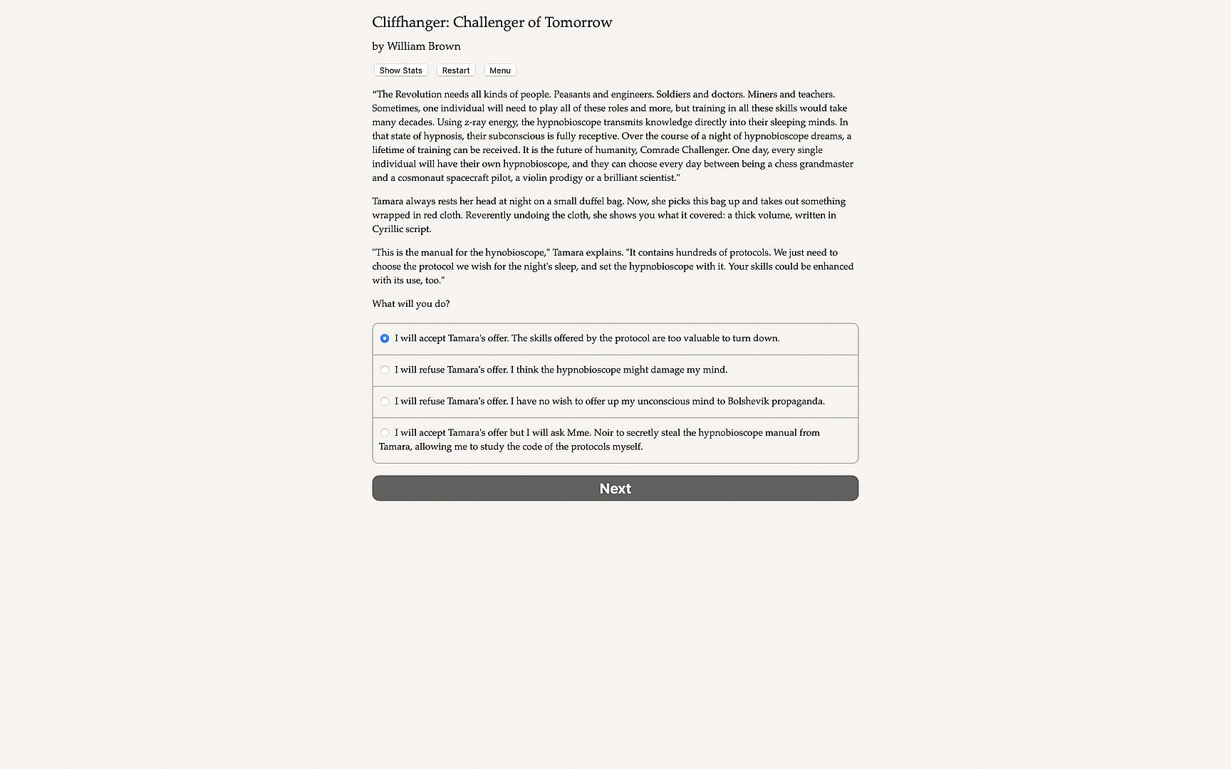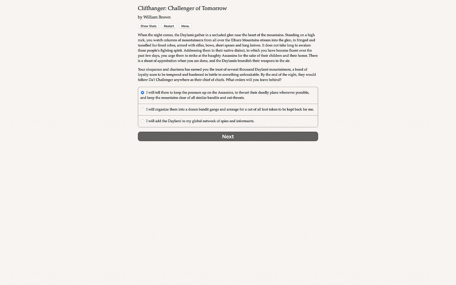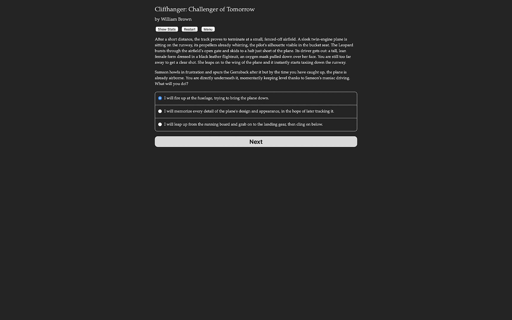 Cliffhanger: Challenger of Tomorrow is a 300,000-word interactive novel by William Brown, author of The Mysteries of Baroque. It's entirely text-based, without graphics or sound effects, and fueled by the vast, unstoppable power of your imagination.