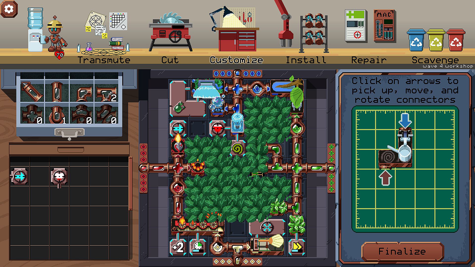 Clockwork Cleanup is an auto-battler where MAC's actions are defined by spell tiles placed in the central grid. The spell tiles are powered by elemental sources located on the perimeter of the grid. You must use pipes and splitters to route the energy to the tiles. Some tiles require multiple elements which can quickly create congestion. Space is limited, but there will be opportunities to expand the grid as you progress.