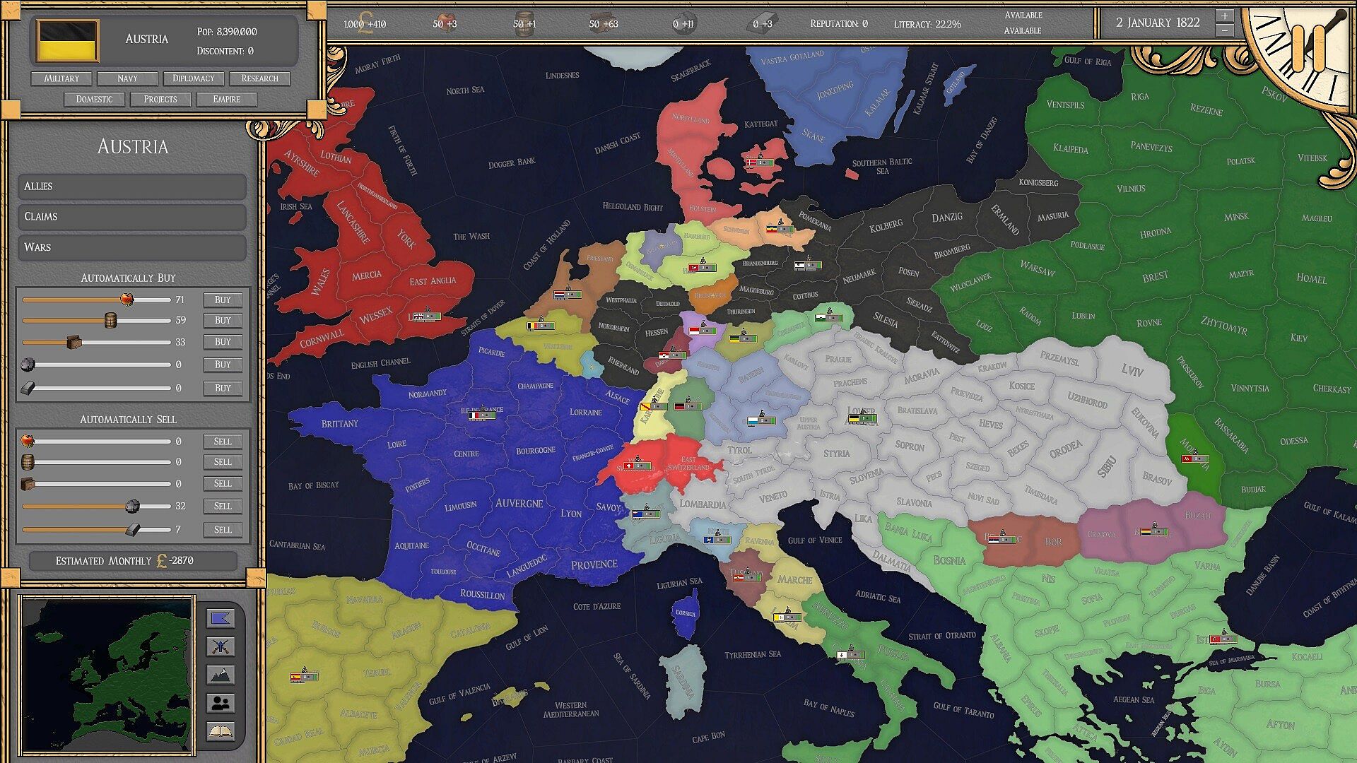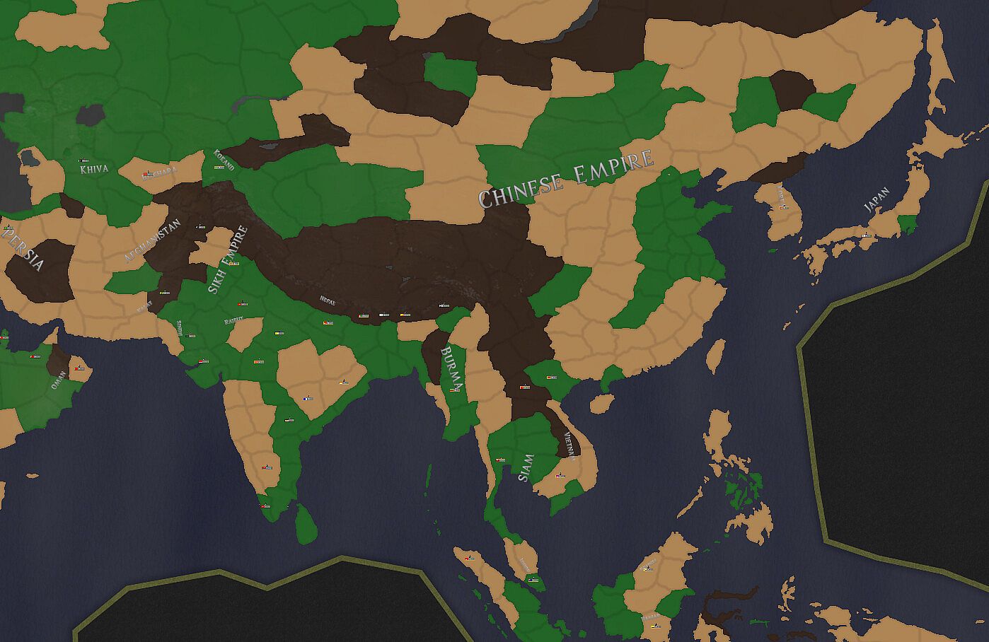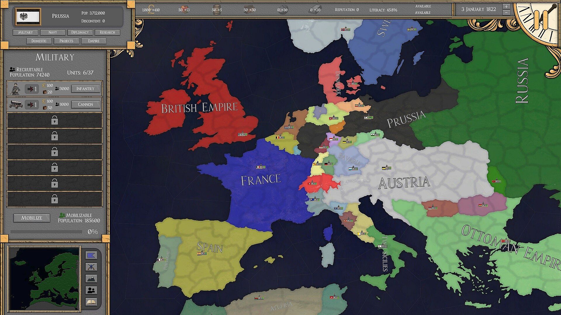Play as one of 100 countries spanning 1306 provinces, each with unique starting situations from population and economics to diplomatic relations. You will need to forge alliances, build your army, and stabilize your country in order to overcome other adversaries.