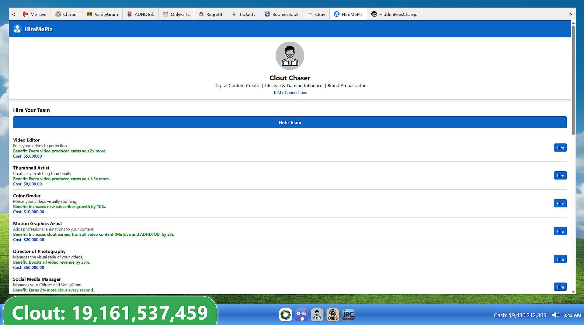 Post on Chirper, upload questionable content to MeTuve, and overshared moments on BoomerBook—all to watch your numbers go up. Hire a team on HireMePlz, automate your grind, and optimize your influencer strategy to become the internet’s most algorithmically adored personality.