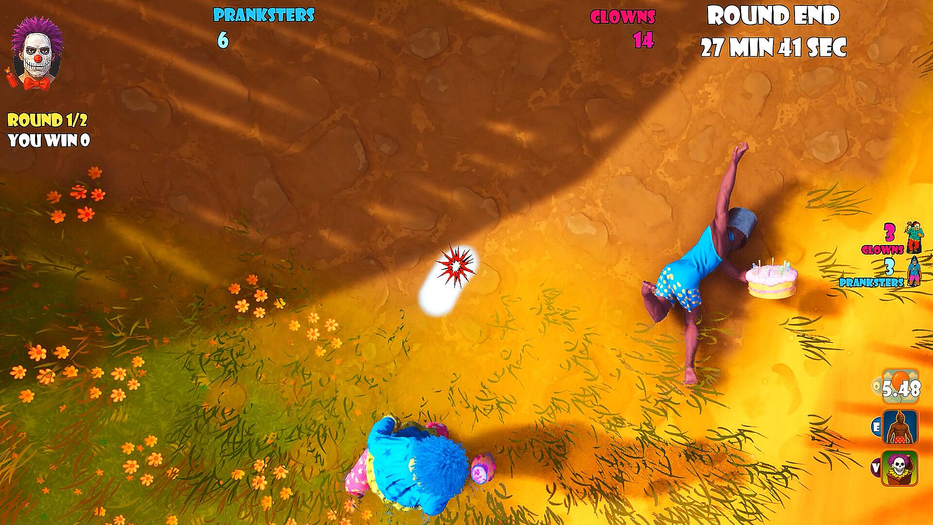 Clowns get 60 seconds to catch a human with their hammer - or they're out.