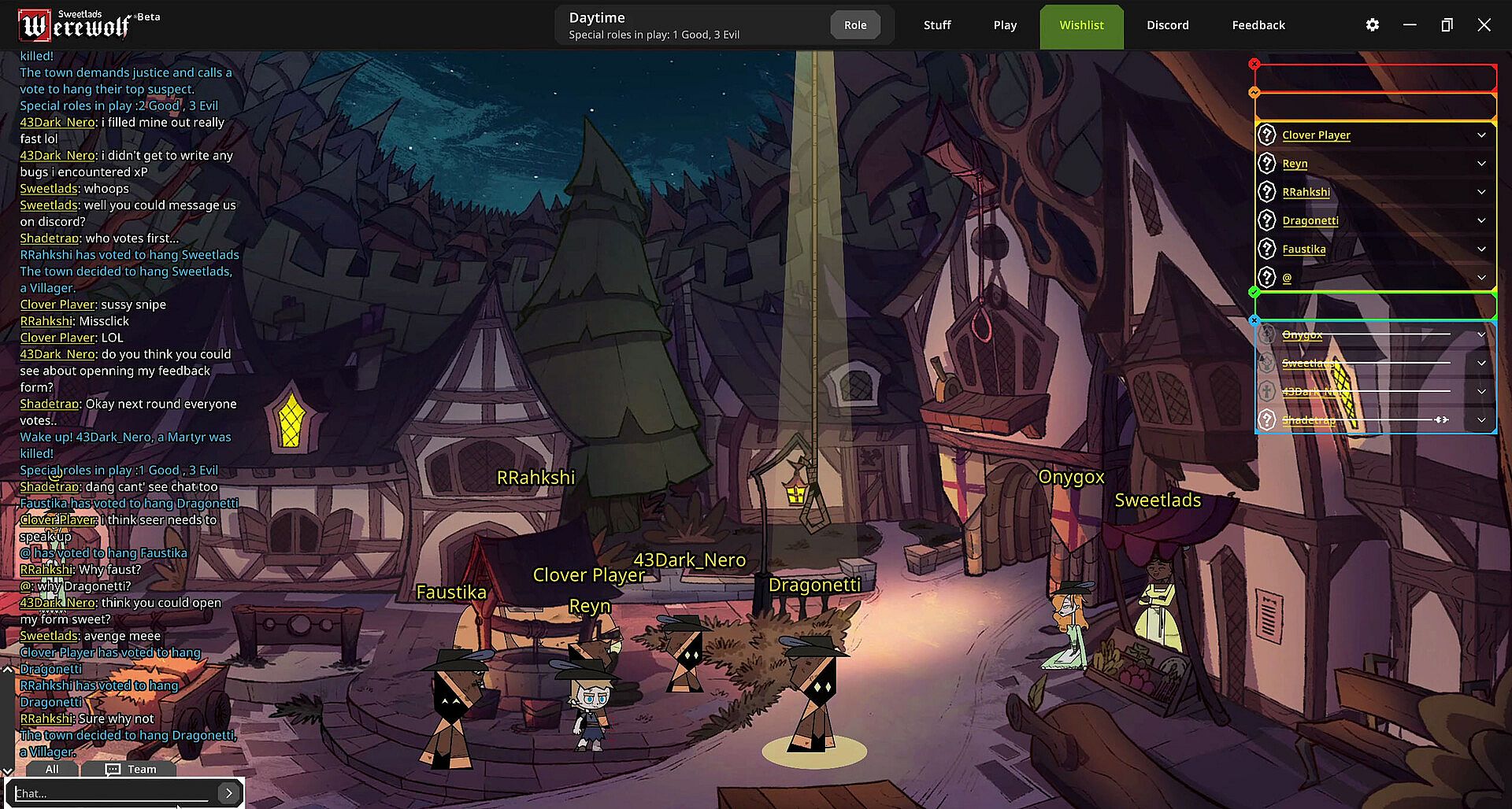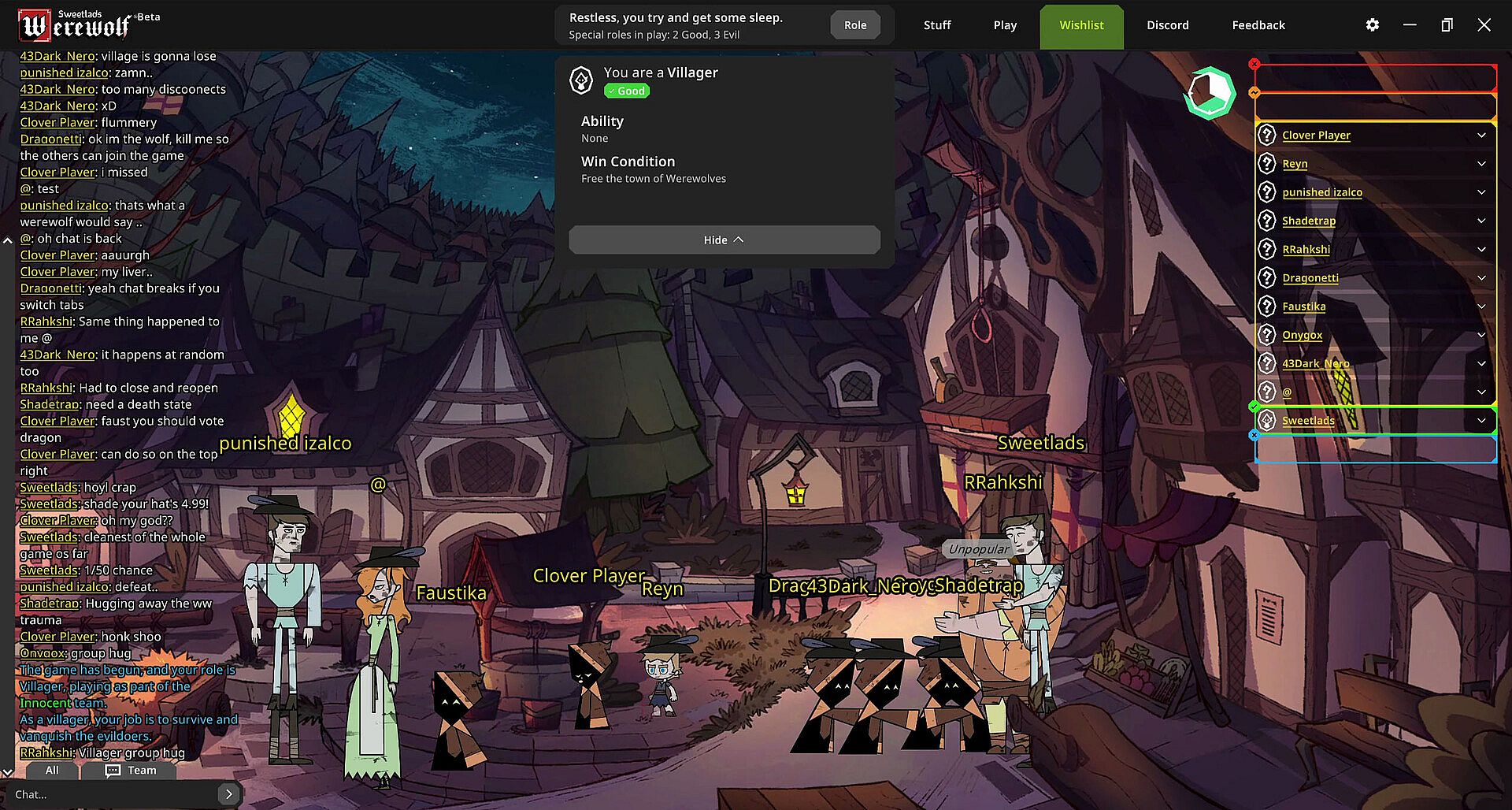 Team Werewolf, can use evil chat - Win by outnumbering the town.