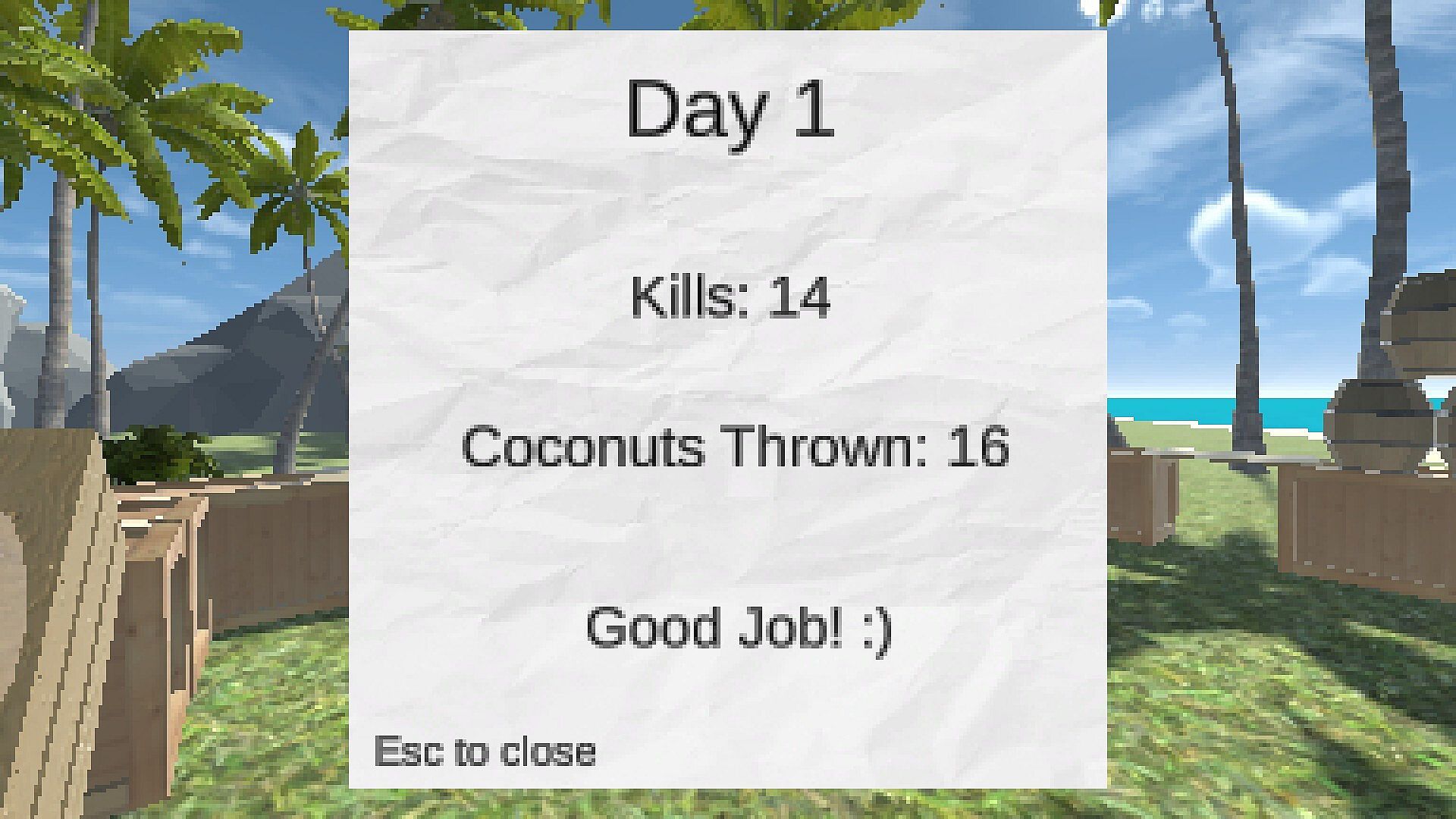 Coconut Party is a stylized 3D action game about throwing coconuts at people. Playing as the king of ancient Hawaii, you must fend off colonist invaders for a short time when they launch their daily attacks in order to protect your island. They will grow in numbers and become more dangerous with each passing day; but don't worry! Your Royal Advisor has been working hard with the people in order to update you on the current colonist situation and make your coconut throwing more effective. With multiple upgrades to choose from each day, make the best choices in order to keep up with the colonists.