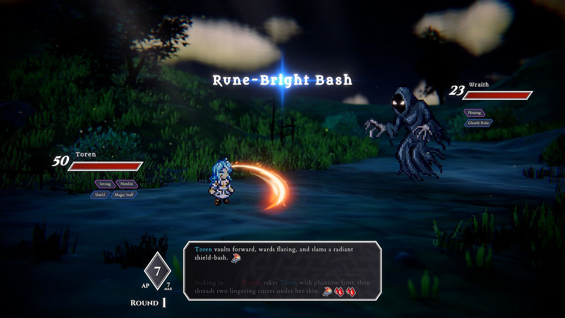 Combat unfolds step by step, guided by clear logic based on your equipment, traits, and current status.