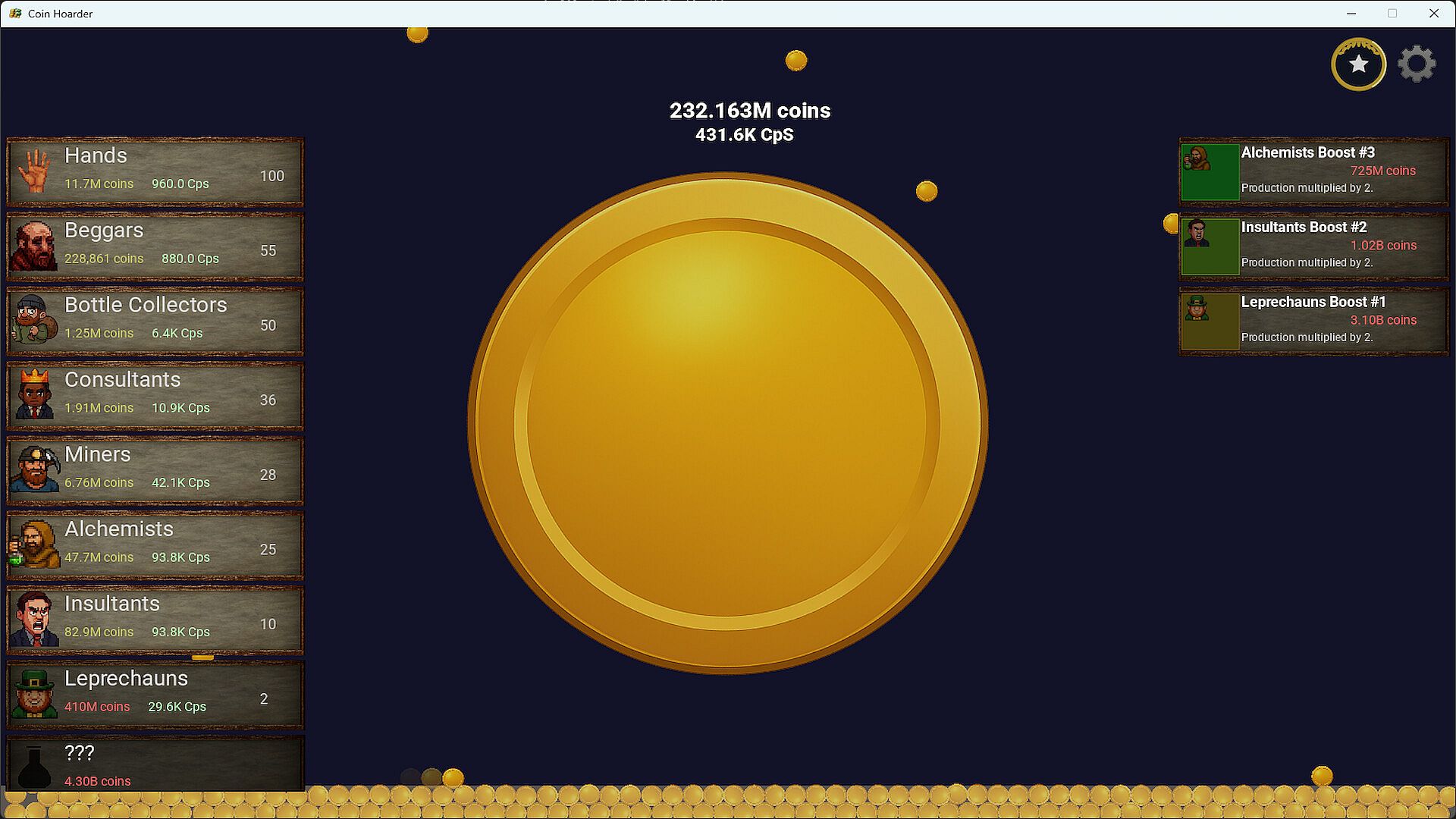 How much gold can you collect? In Coin Hoarder, every click, every upgrade, and every prestige brings you closer to unimaginable riches.