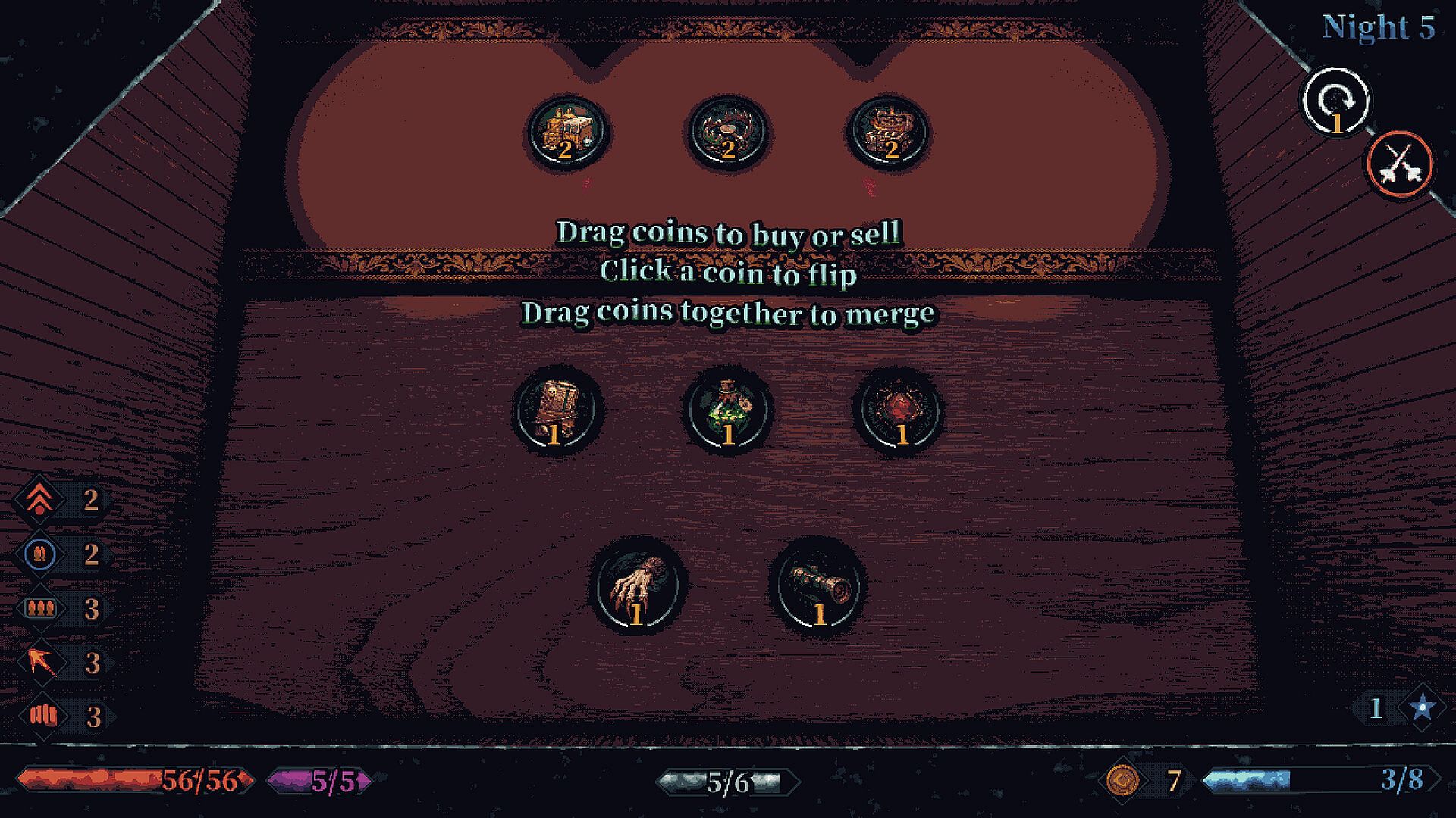 Trade & Mint: Buy and sell randomized coins from merchants, or fuse them together to forge powerful synergies.