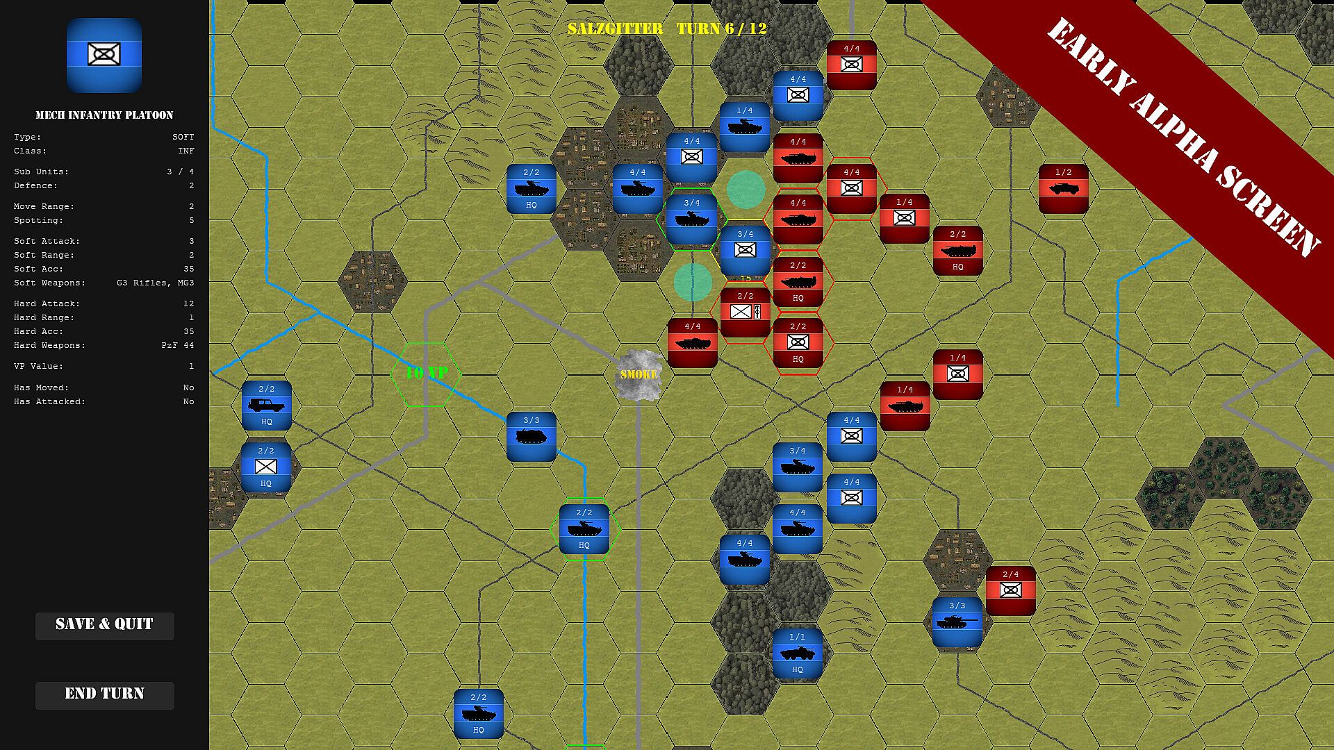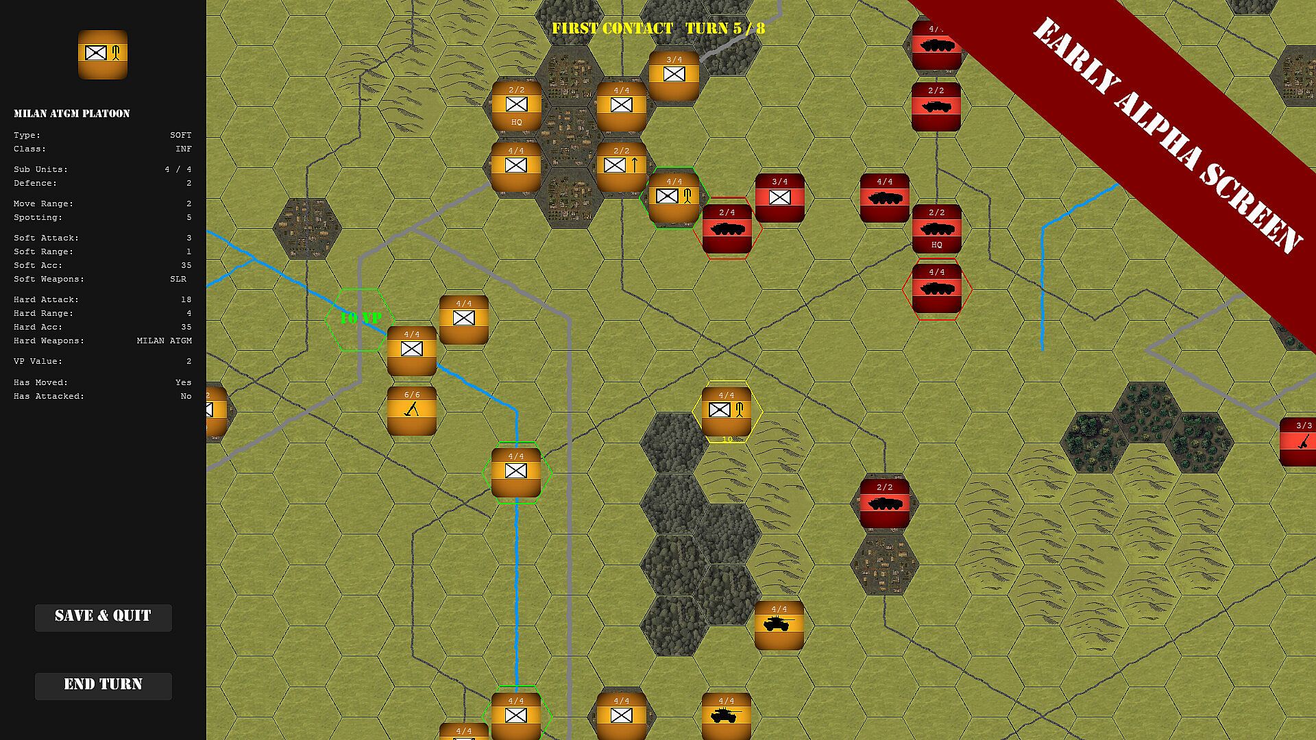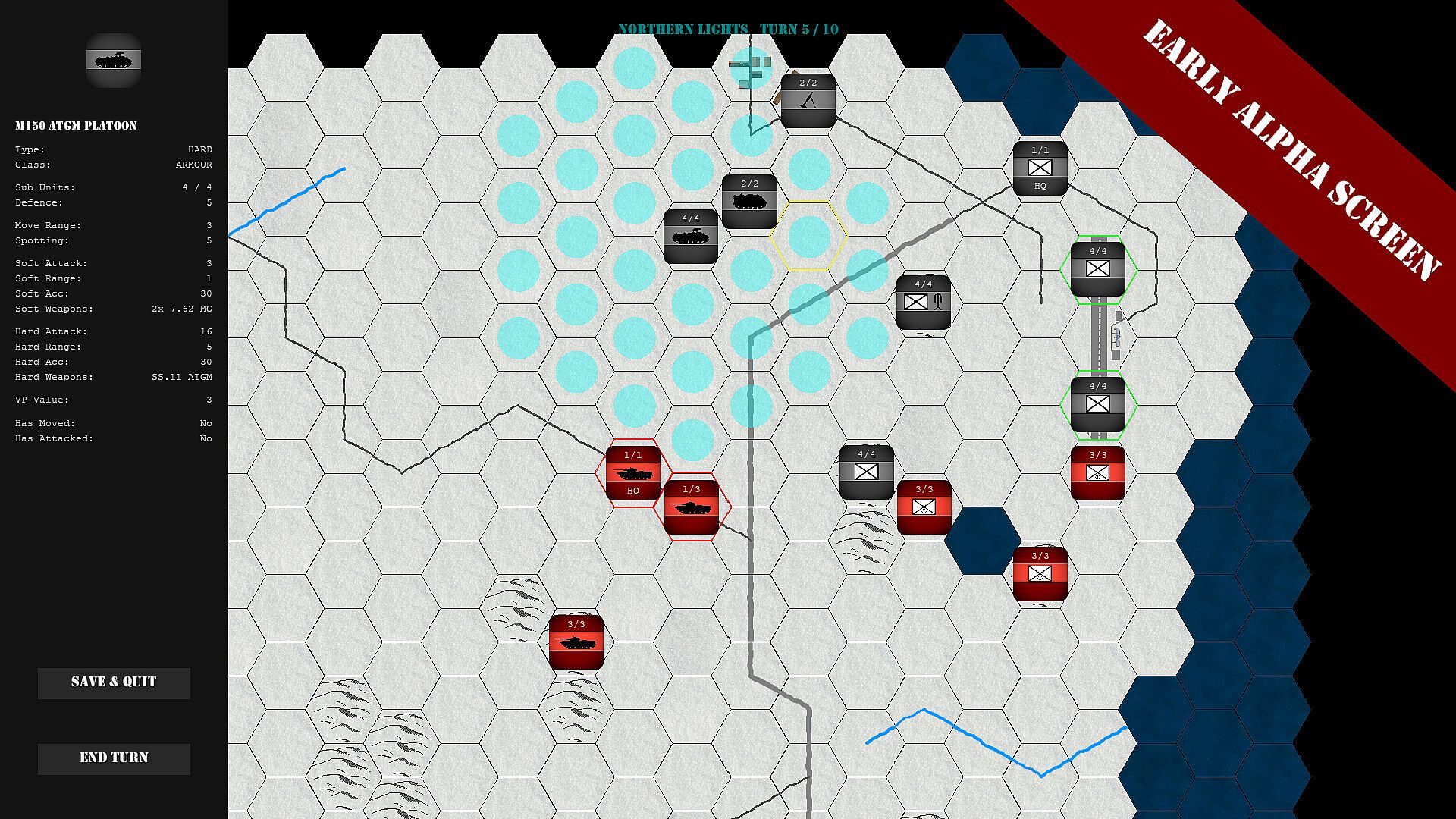 Cold War Battles is a quick playing, easy to learn, Turn Based Hex and Counter Wargame. CWB features real and hypothetical conflicts from 1945-1990. Whilst simple to pick up and play there is still plenty of tactical depth, you will need to take terrain and cover into account as you move your troops, use smoke to block line of sight, decide when and where to unload your transports or call in Artillery and face a tough AI opponent as competent at attacking as it is defending.