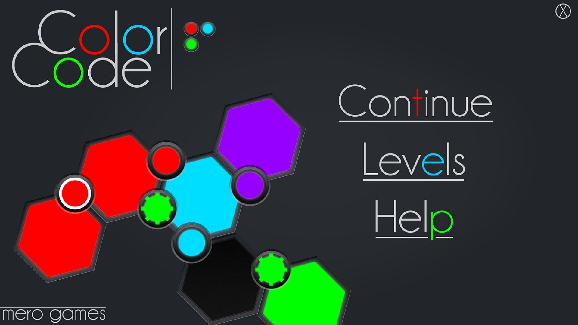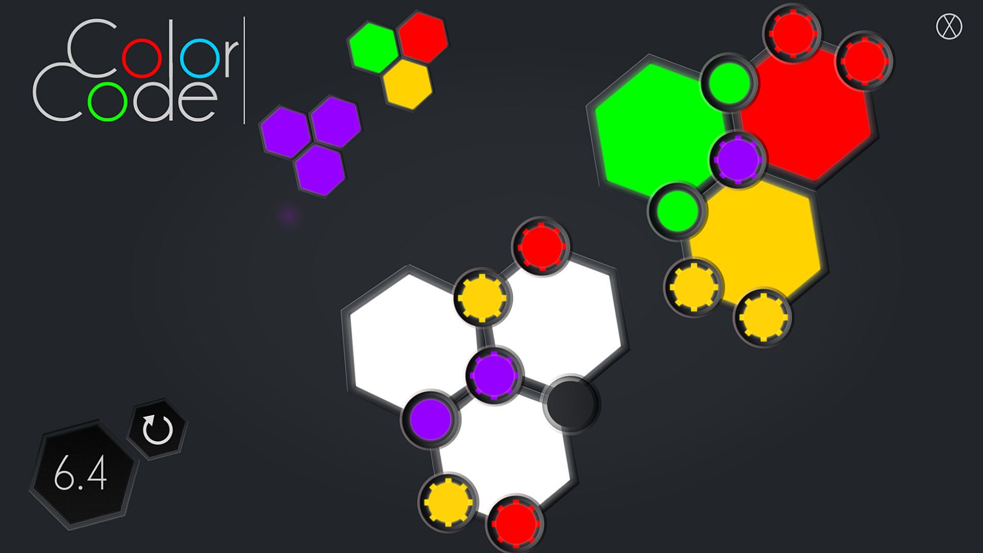 Currently there are 7 level packs (besides the tutorial). Each level pack adds new concepts to the game, to keep you on your toes. No reason to worry though, the brain teasing logic and fun behind Color Code is guaranteed. In these levels you will meet buttons like “Locky” (you can’t change it’s color), “Pairy” (comes in pairs, both change to the same color), “Powerball” (the hexagon will have this button's color, regardless of how many other colored circles are on the hexagon) and others.