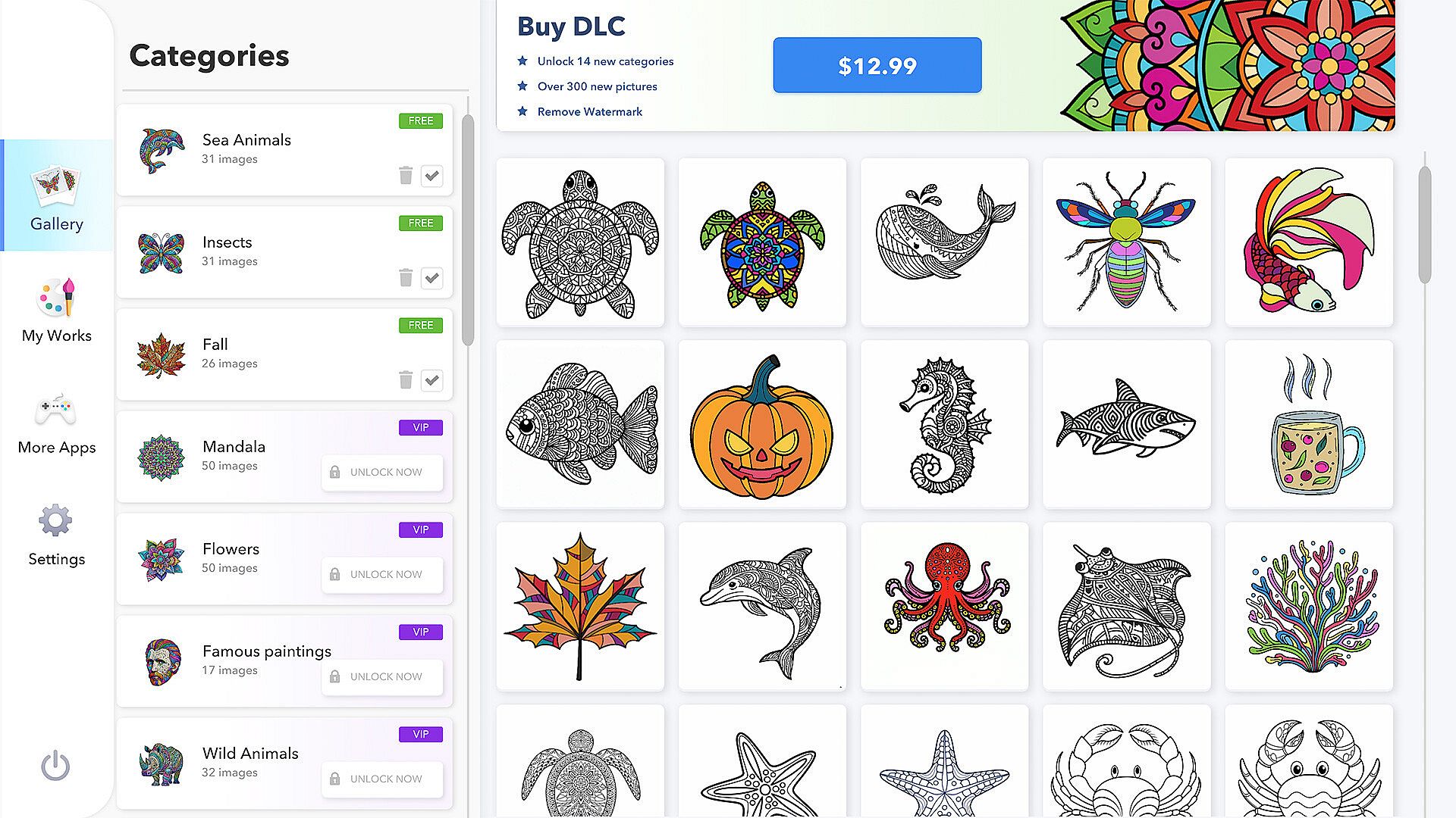 Welcome to Coloring Book for Adults 2, where creativity meets relaxation! Dive into 17 NEW mesmerizing categories with a multitude of coloring sheets, ranging from Sea Animals, Birds to Insects, and embrace the beauty of Mandala, Famous Paintings, and more. Whether you're coloring detailed Wild or Domestic Animals or celebrating holidays like Easter, Valentine's Day, or Xmas & New Year, you’ll find the perfect canvas to express yourself.
