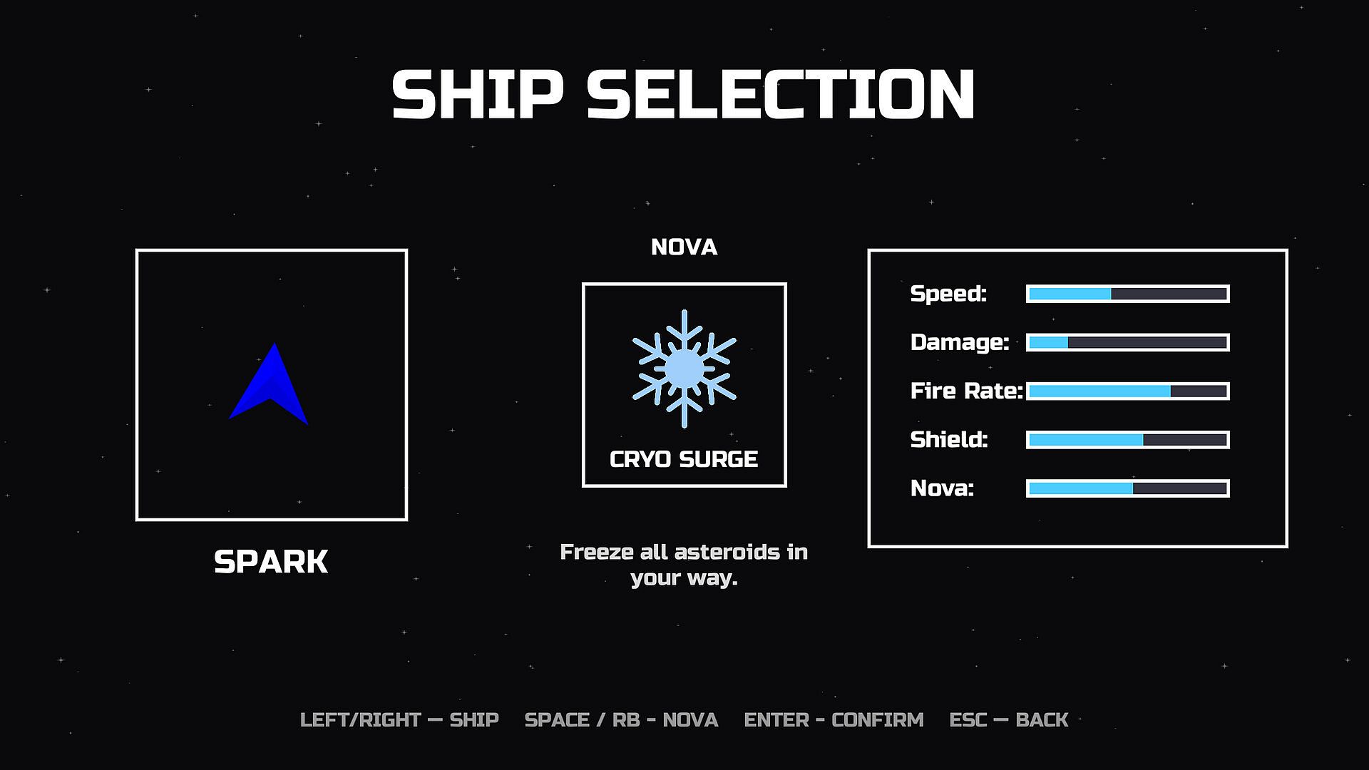 Choose from six spacecrafts, each with unique stats and designs. Find your ideal balance of speed, damage, and control.