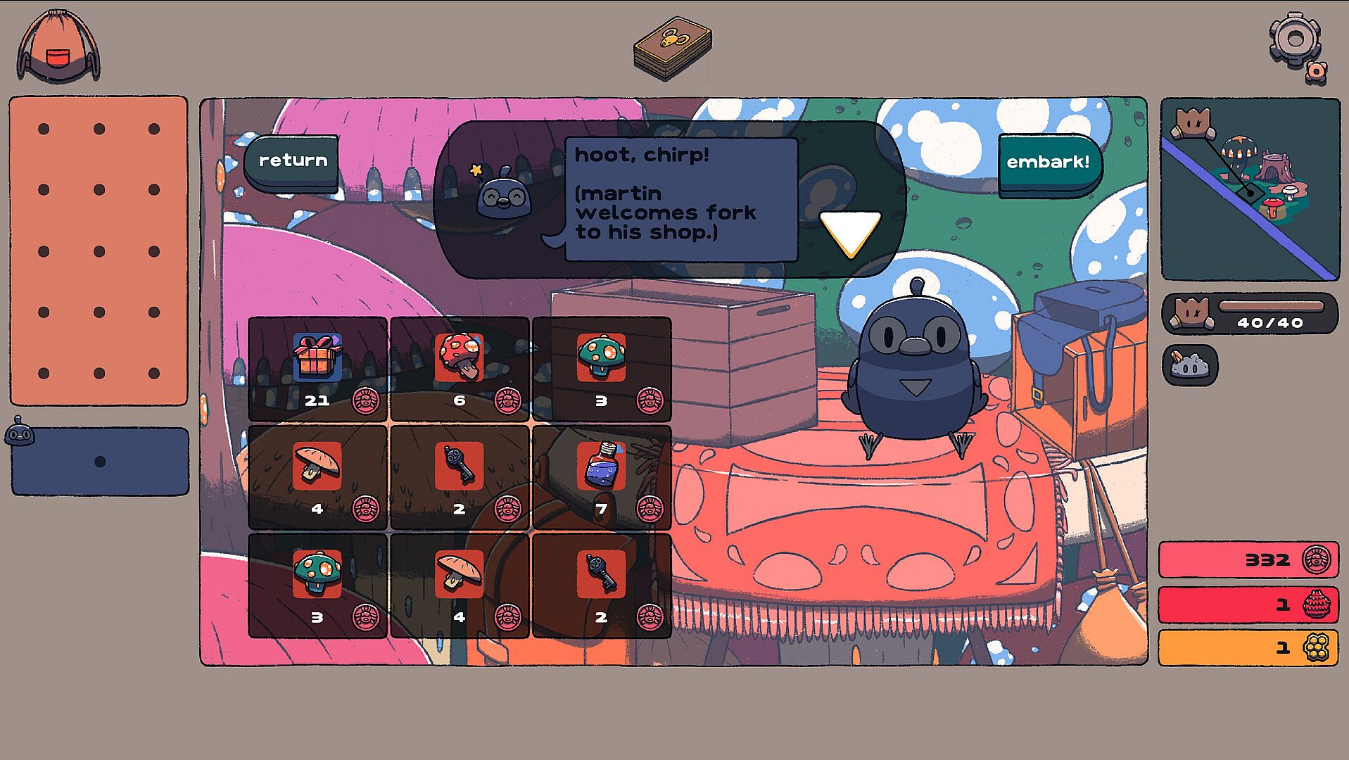 • Everyone knows that consumables are red, curios are blue, and the way Fork manages his knapsack is up to you!