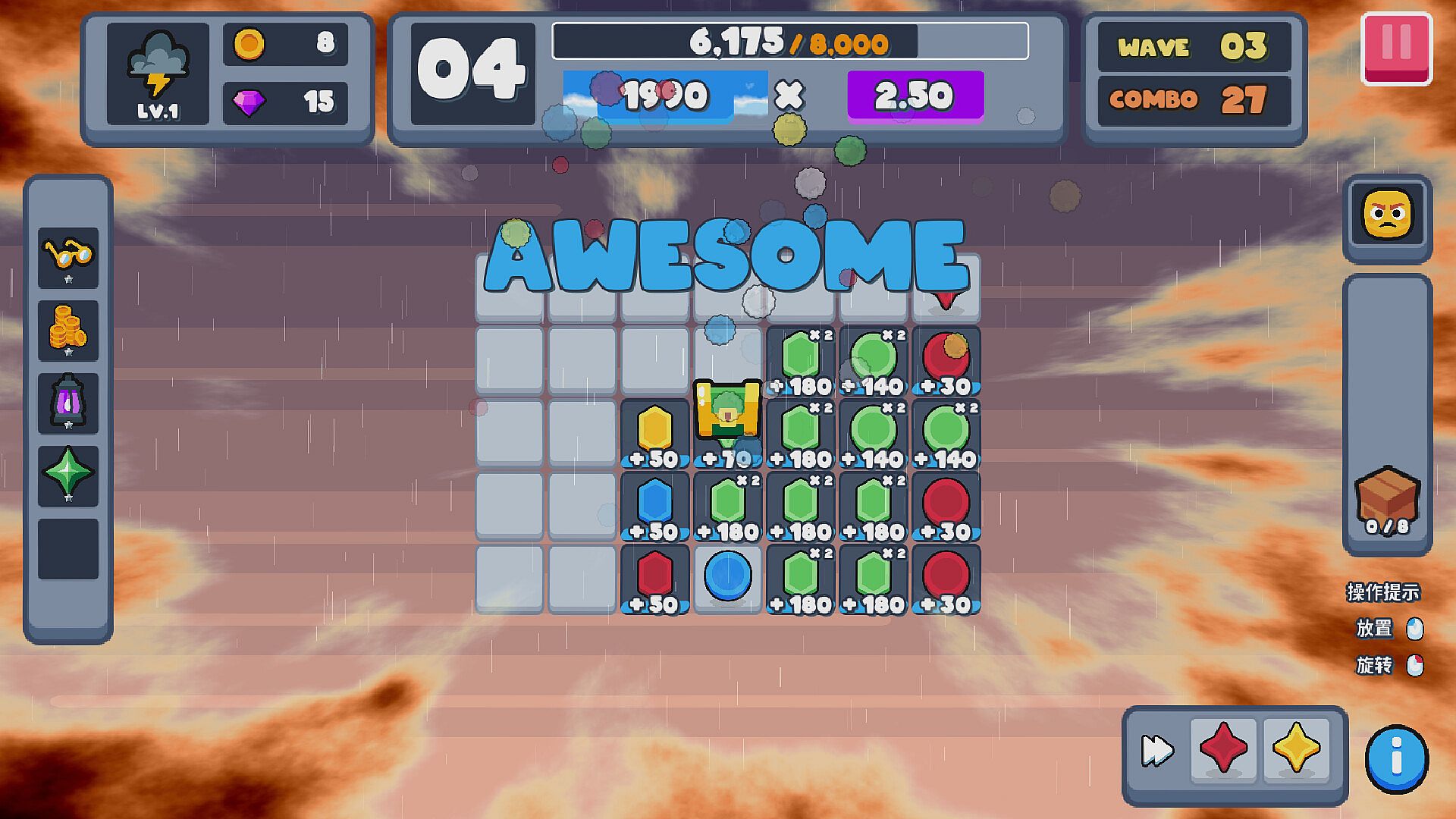 A strategic placement game that combines card-building elements. Carefully arrange pieces on the board to create combos through strategic matching, trigger chain reactions, and achieve daily targets. Face unpredictable weather challenges, experience the thrill of creating massive combo chains, and take on increasingly difficult challenges.