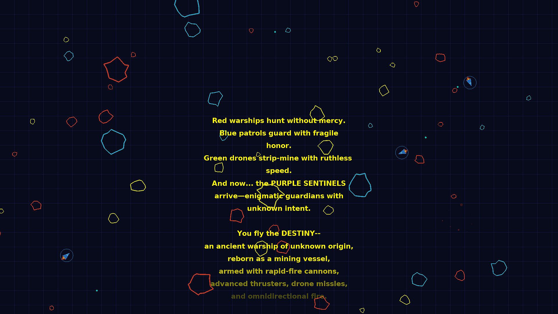 You pilot the DESTINY—an ancient warship of unknown origin, reborn as a mining vessel and armed to the teeth. With rapid-fire cannons, advanced thrusters, drone missiles, and omnidirectional fire at your command, you must survive the chaos.