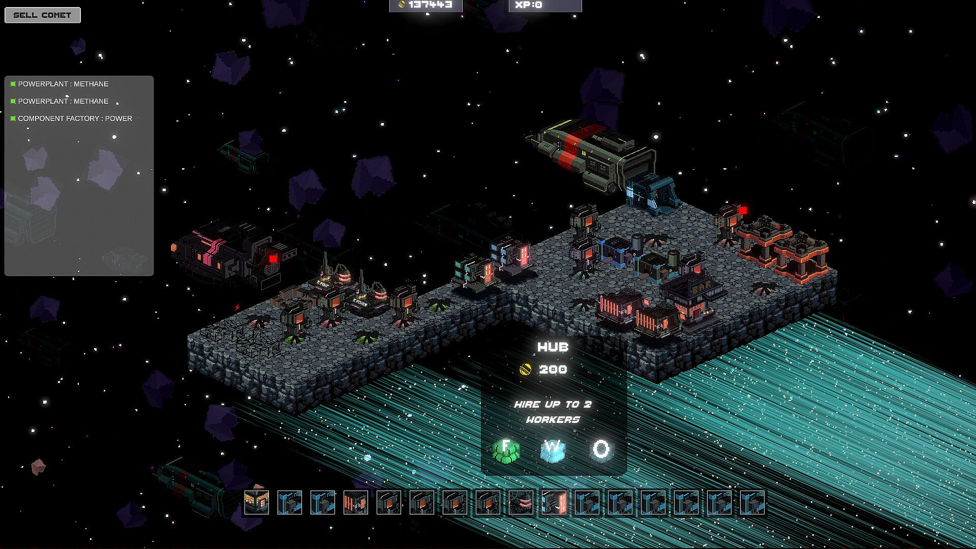 As word spreads of your comet, space tourists and those just passing by may land; seeking shelter, snacks, or perhaps just a place to breathe. Build facilities to keep them alive (while they have creds). Entertain them with facilities like the Arquaid, satisfy their thirst at your bar, or perhaps they desperately need your oxygen. But in space, air isn't free.