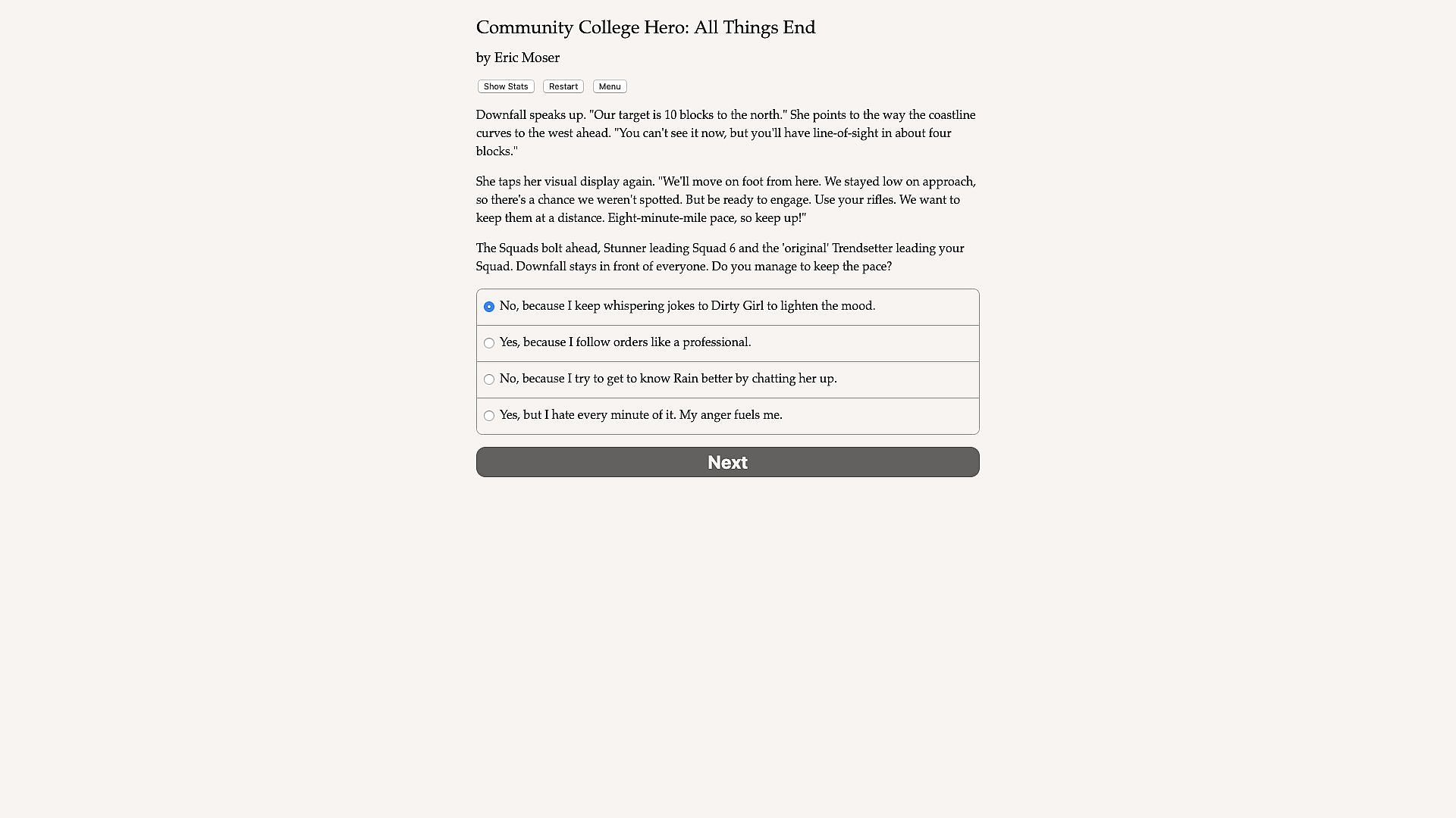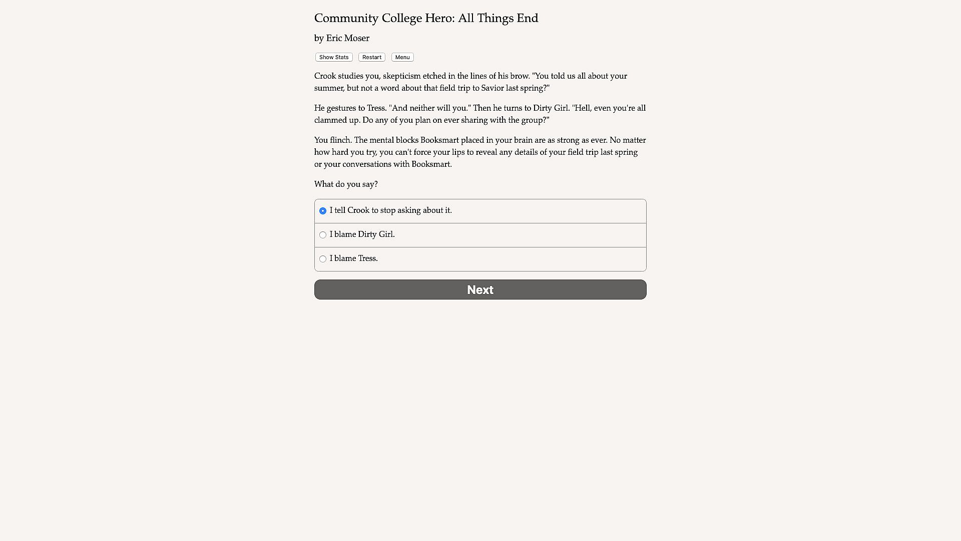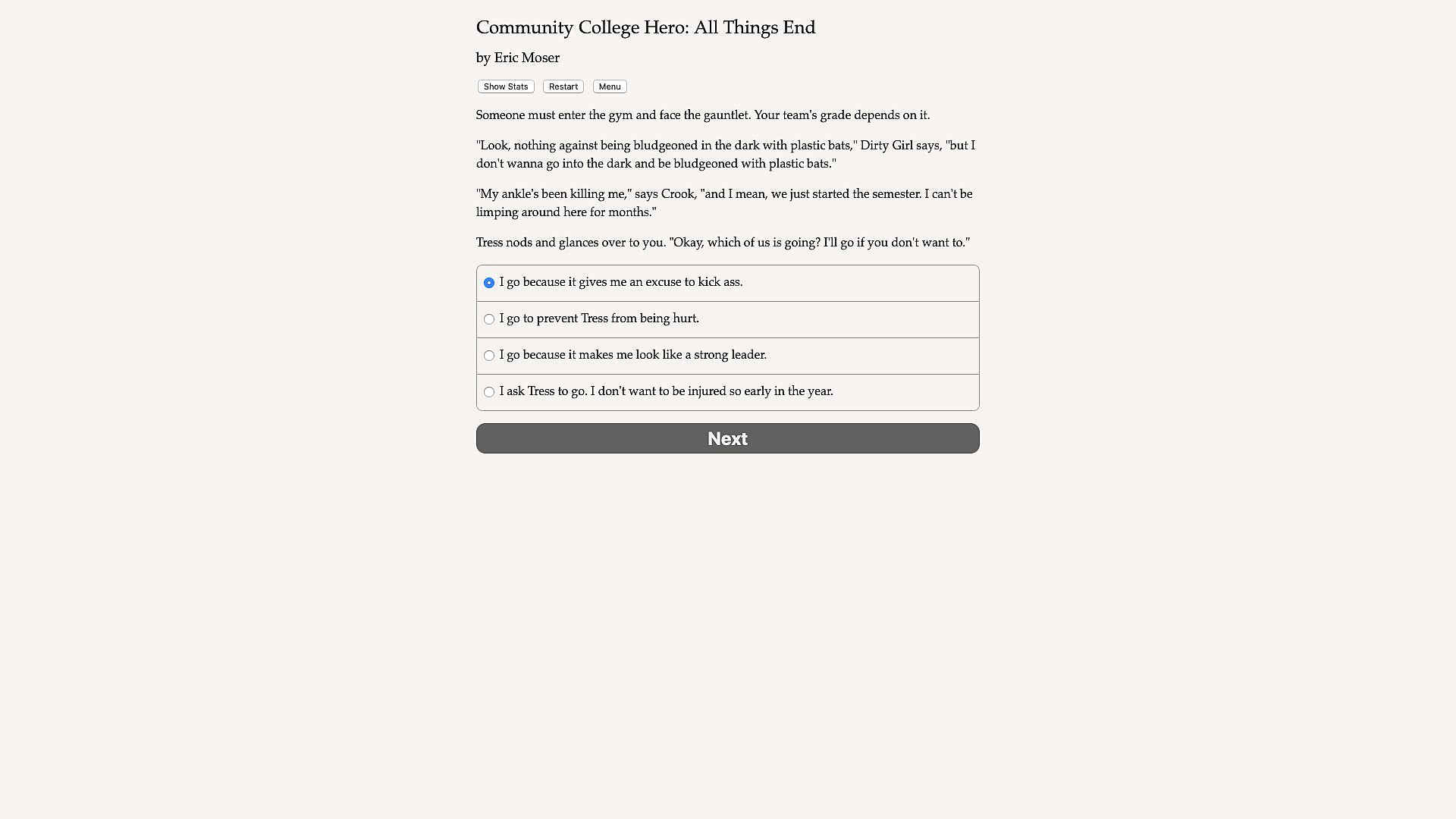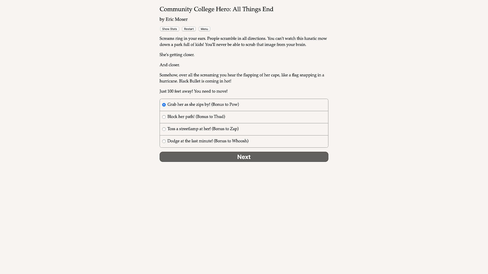 Community College Hero 3: All Things End is the superpowered finale to the Community College Hero series of interactive novels written by Eric Moser, where your choices control the story. It’s entirely text-based-without graphics or sound effects-and fueled by the vast, unstoppable power of your imagination.