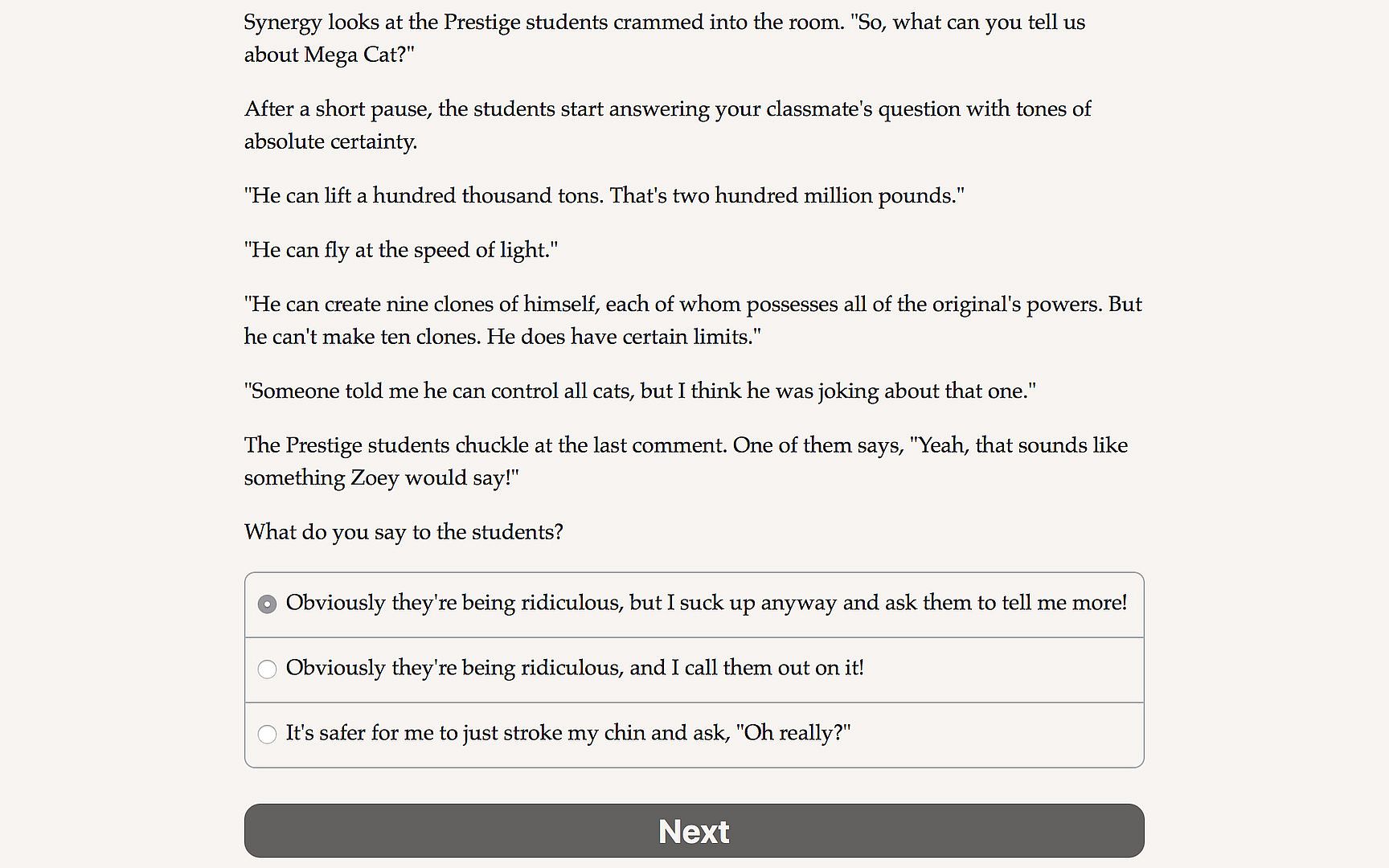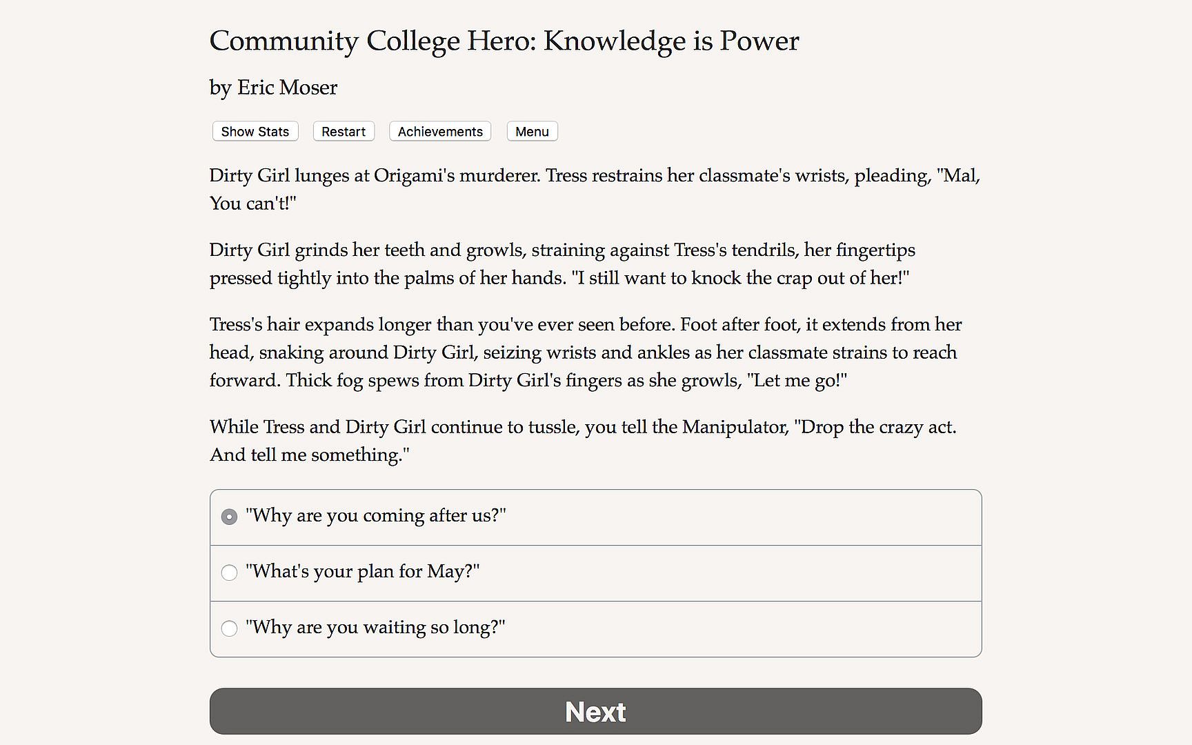 Community College Hero 2: Knowledge is Power is a superpowered 200,000 word interactive novel by Eric Moser, where your choices control the story. It's entirely text-based—without graphics or sound effects—and fueled by the vast, unstoppable power of your imagination.