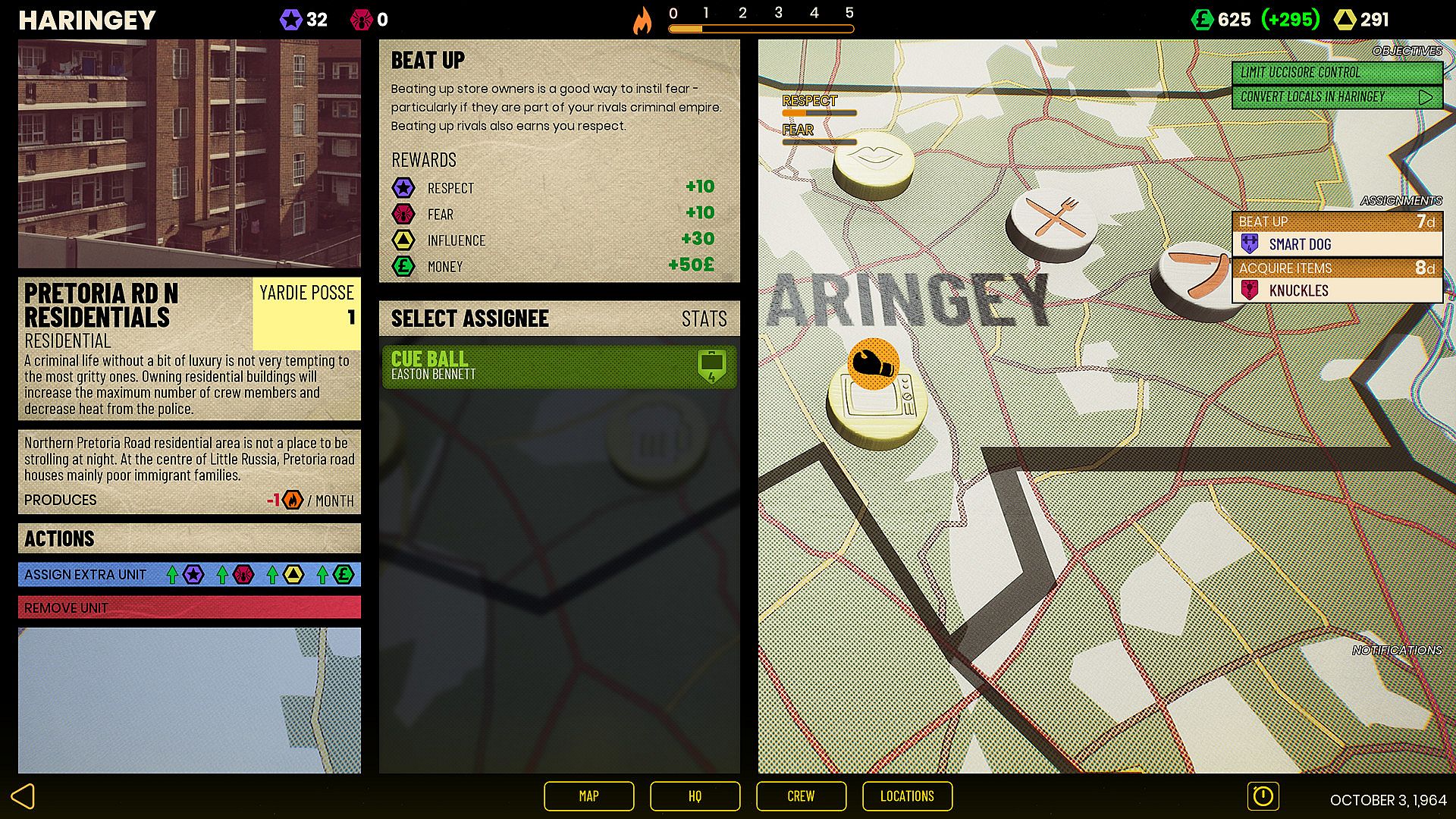 While your task is to create an empire of crime or to tear it down, this is not just your story. This is a story of 1960s London with beatniks, mods, lemonheads, rockers and every other cultural identity of the time. It’s also a story of a falling empire. The Cold War UK is shining in the cultural world, but is facing ever-increasing pressure from inside and out. There is a mysterious order trying to tear down the British Empire from the shadows, and who better to fight it than experts of the underworld and the famous Flying Squad.