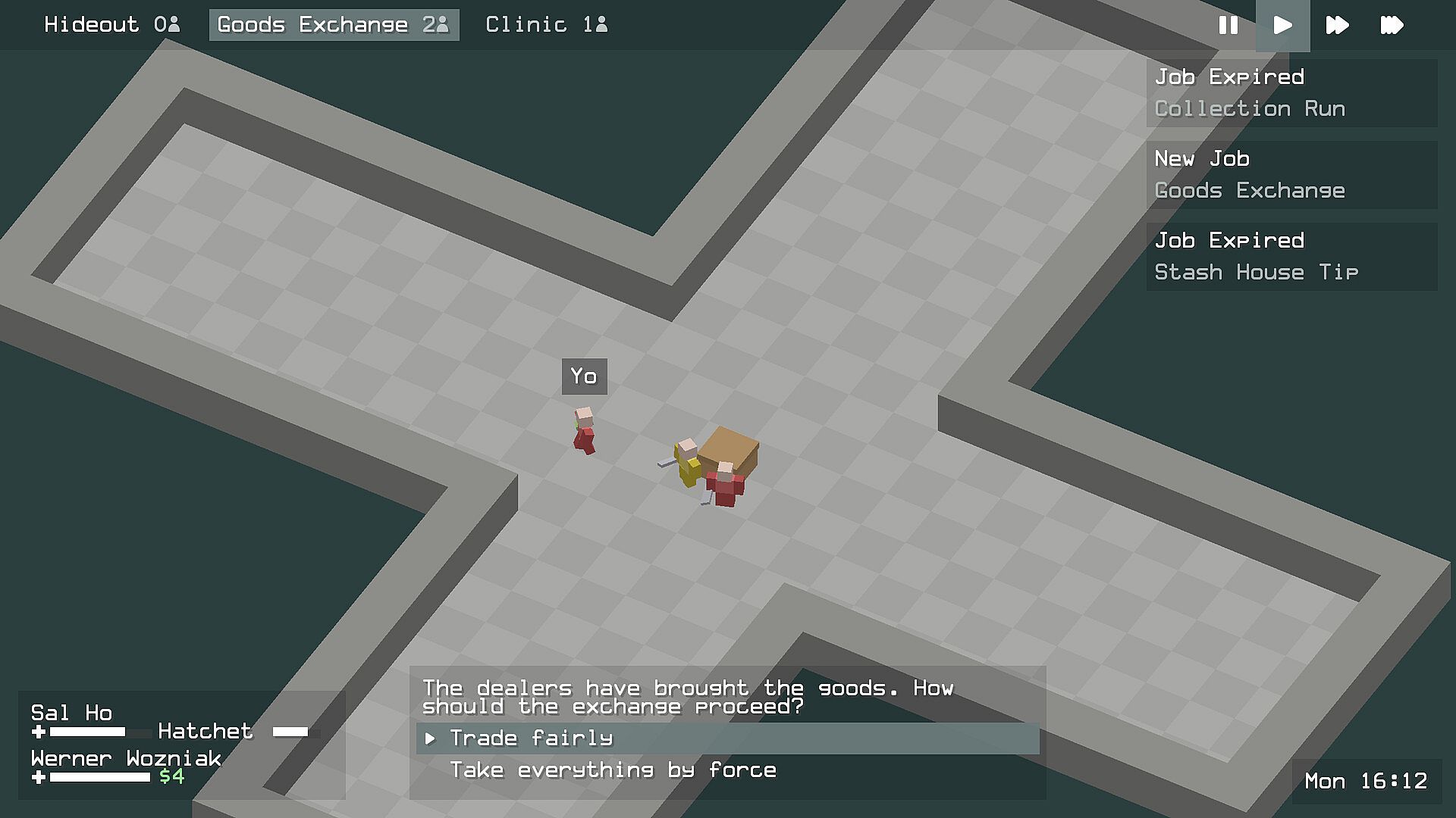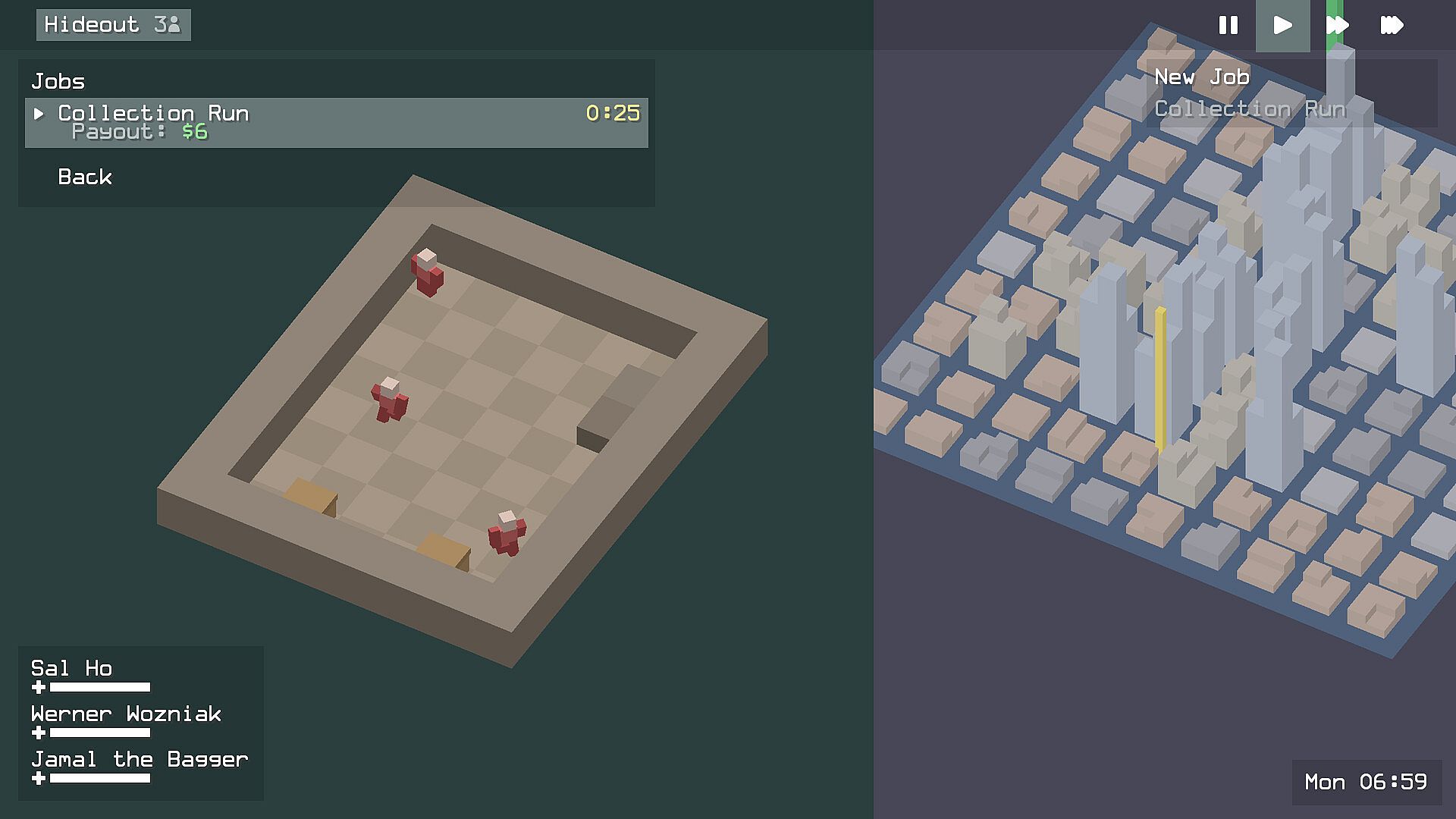 Your hideout is home base. From here, browse incoming job offers, check your roster, and head into the city. Jobs come in throughout the day—collection runs to shake down local businesses, goods exchanges to move product, or riskier operations that pay better but demand more. Select your crew carefully: up to four thugs can deploy on any job, but sending wounded or unmotivated members is asking for trouble. Navigate menus with the arrow keys, confirm with Space or Enter. Use Shift + number keys to switch between locations in the toolbar.