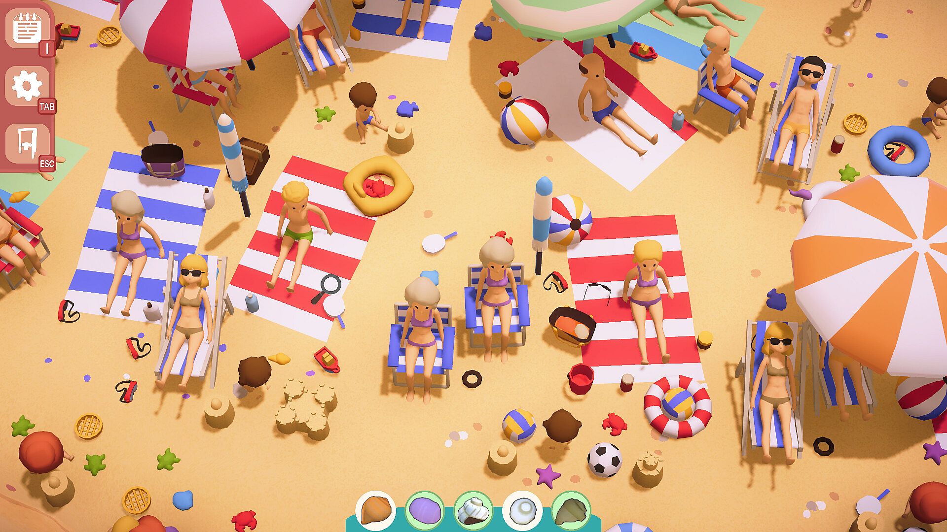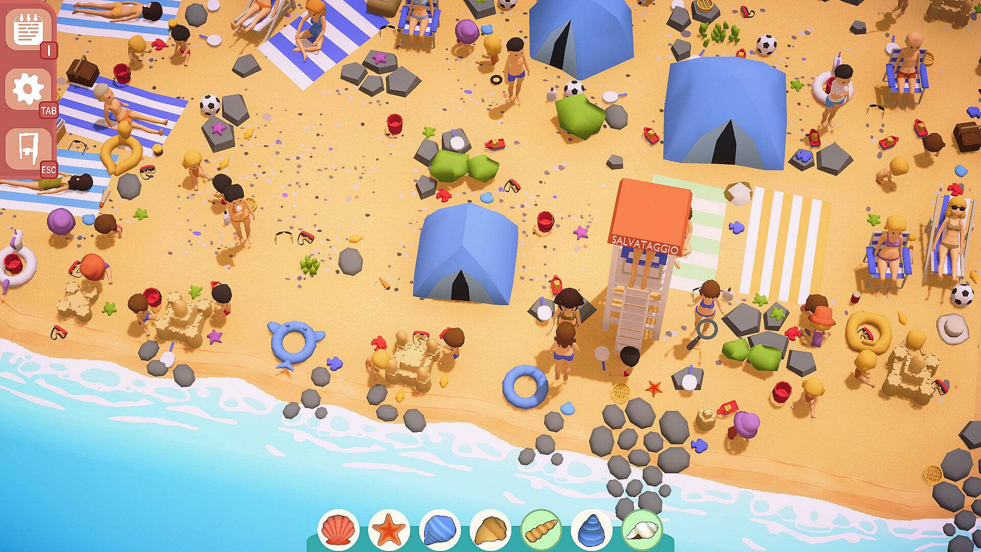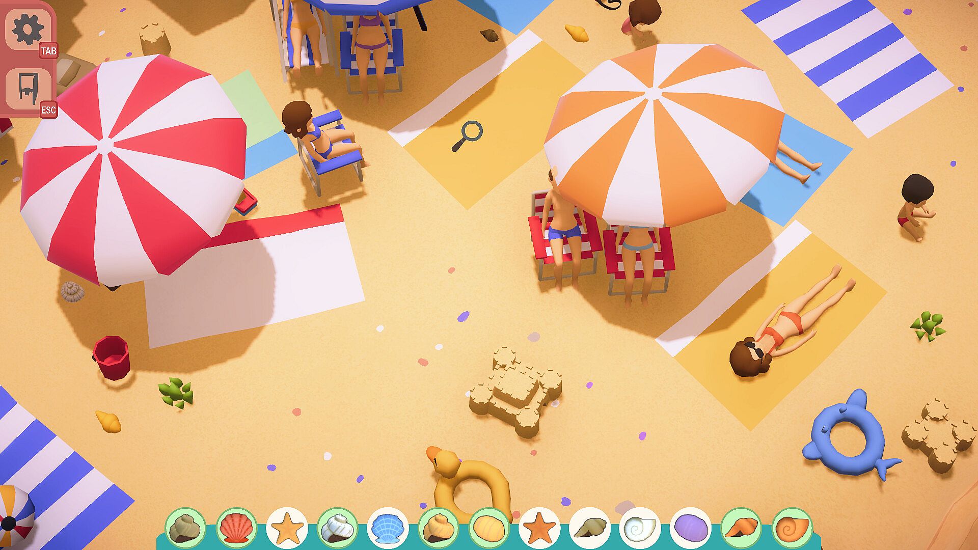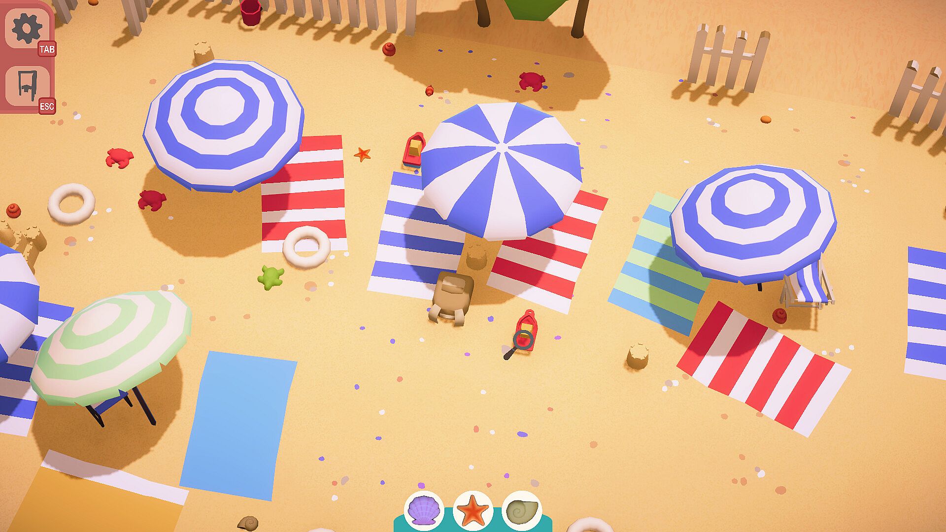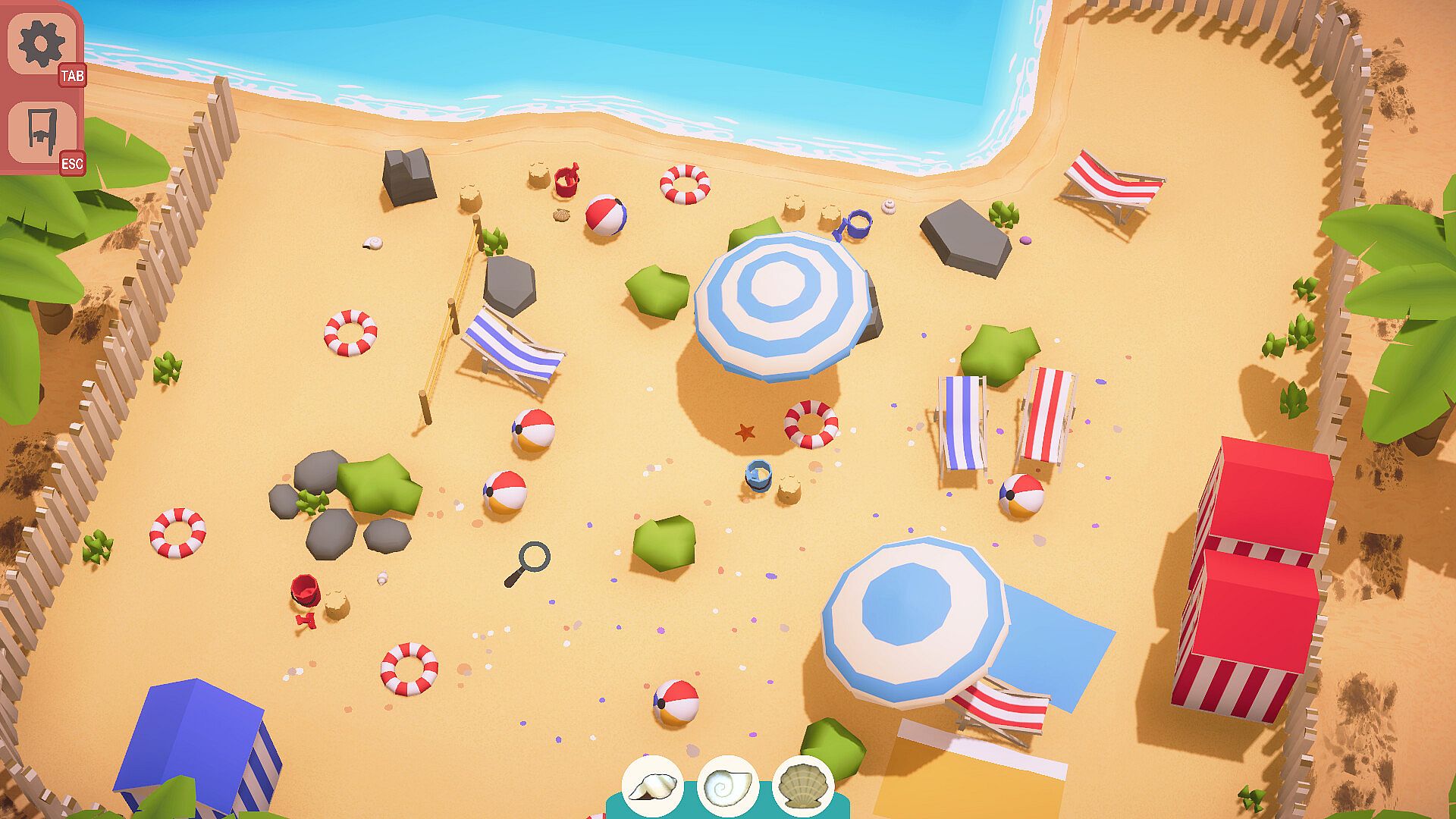 Close umbrellas and beach chairs, open cabin doors, do whatever is necessary to clear the view of objects that might cover shells, and more generally interact with everything on the beach.
