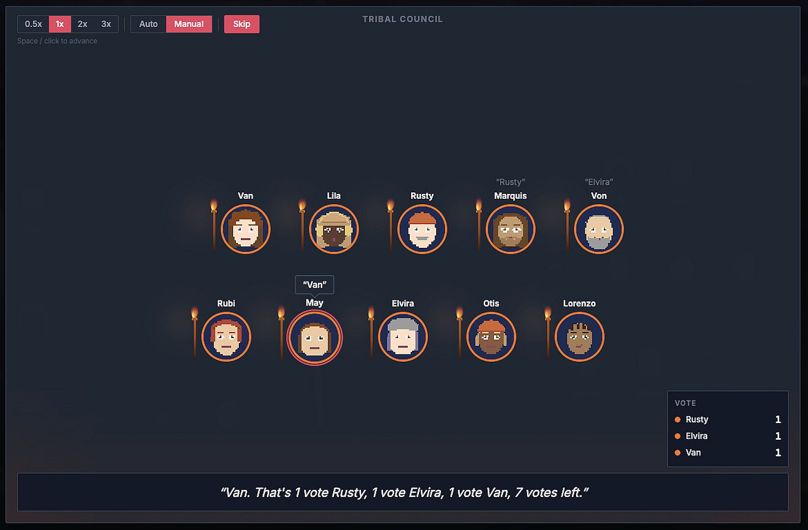 Alliances form in whispered conversations and fracture in public blowups. Relationships evolve across five dimensions (trust, affinity, resentment, fear, and familiarity) creating a web of social dynamics that shifts every single day. Hidden immunity idols get found, hoarded, played, and wasted. Tribal councils play out with dramatic vote reveals, blindsides, split votes, idol plays, rock draw tie-breakers, and fire-making duels. Every vote is a story.