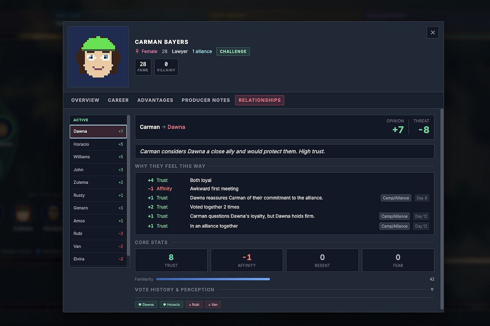 Contestants aren't robots. They have a deep mood system tracking happiness, stress, fatigue, hunger, and mental state β and it all shifts day to day based on what happens to them. A blindside tanks trust across the tribe. A reward win lifts spirits. Going too many days without food makes everyone irritable and unpredictable.