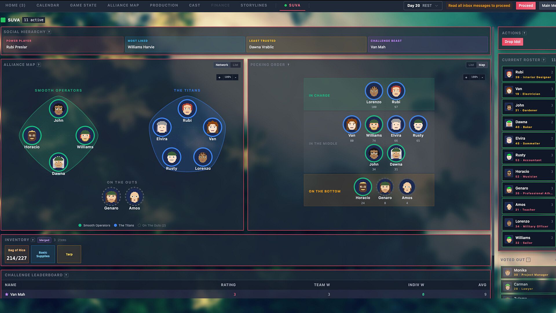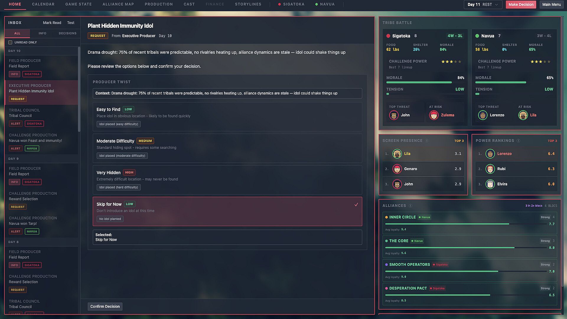Your entertainment rating is everything. It's calculated from drama, suspense, strategic gameplay, and character moments β and it directly drives your revenue. A boring, predictable season with a safe boot order loses money and viewers. A season full of blindsides, underdog runs, and iconic tribal councils becomes a cultural moment. But there's a line. Get caught being too heavy-handed β rigging outcomes, pushing vulnerable contestants, manufacturing drama that crosses ethical lines β and you'll face consequences. Network scrutiny, public backlash, and a reputation that follows you into future seasons.