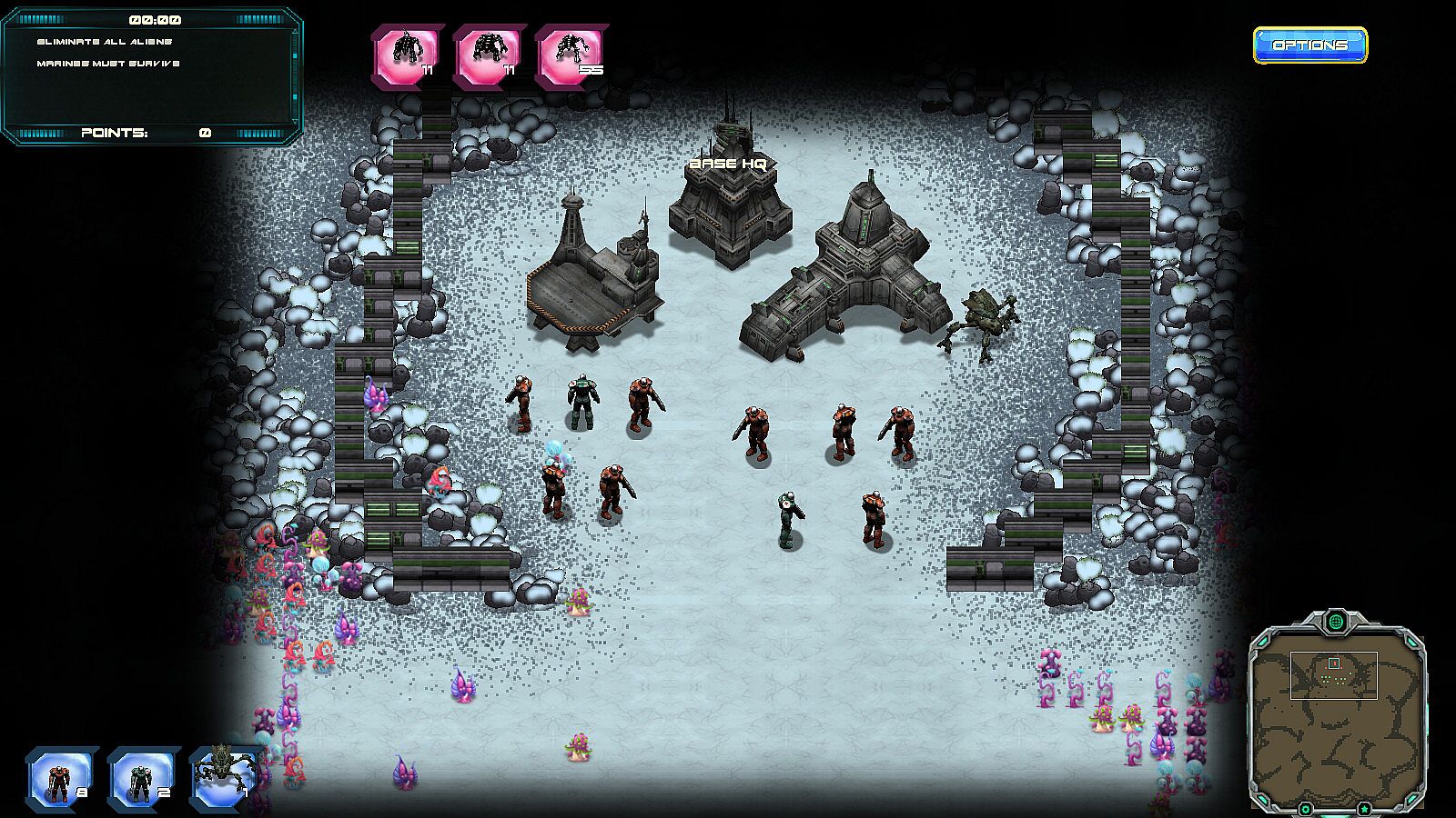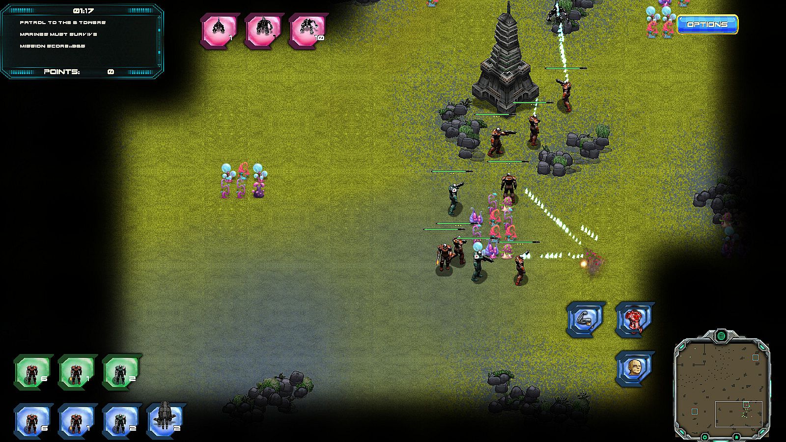 At your disposal are infantry with assault rifles, flame throwers, heavy combat shotguns;mechs with laser rifles and flame throwers, medics with the latest in battlefield healing technology and also air support and artillery. Throw into the mix armoured personnel carriers that can fly to anywhere on the battlefield and you've got yourself a force worthy of eliminating the alien enemies.