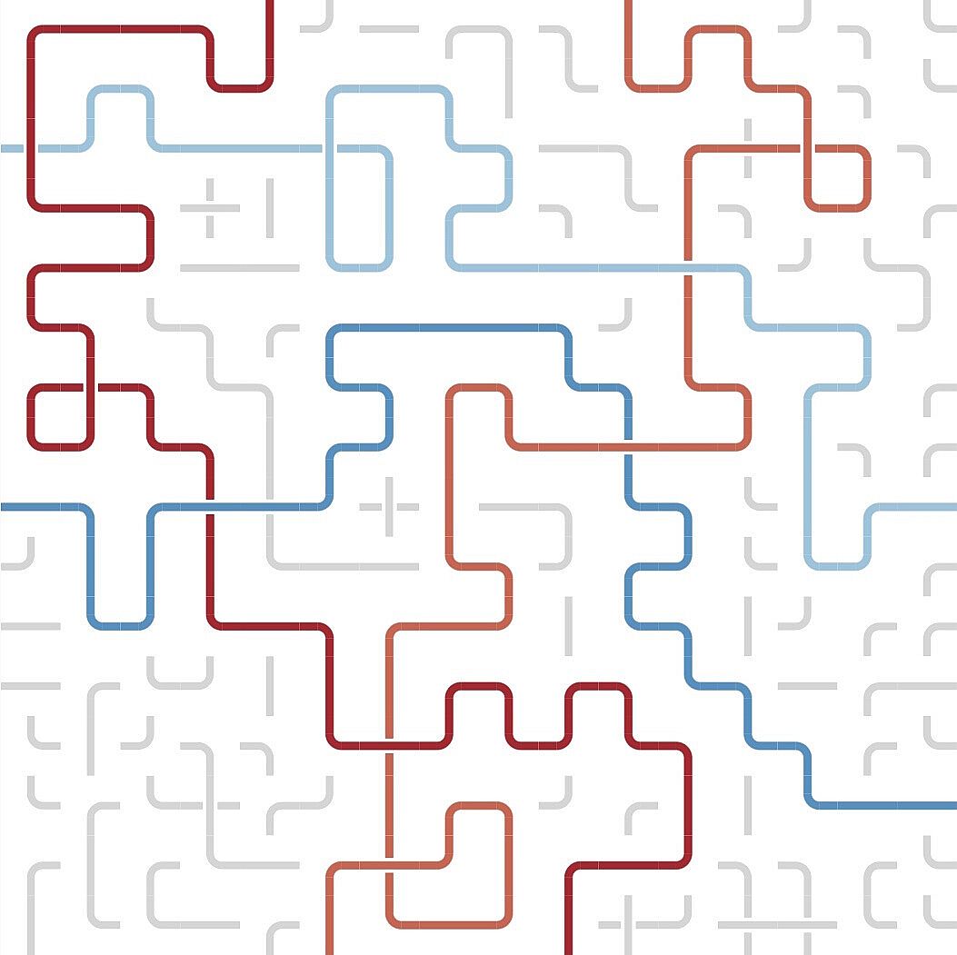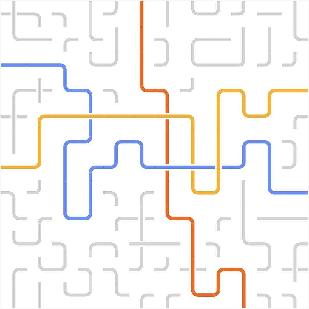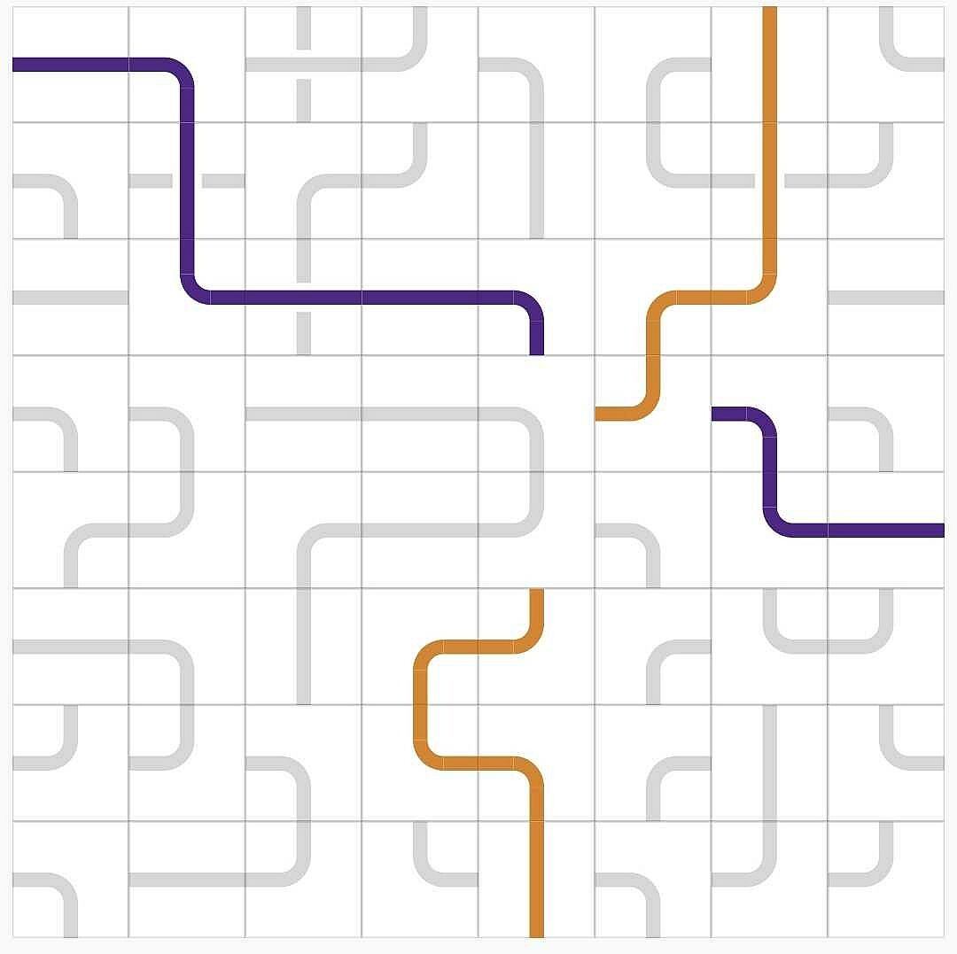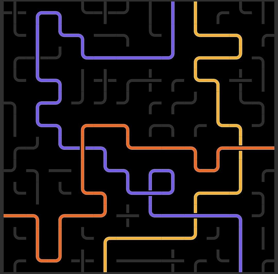 You are challenged to bring order into the jumbled mix of lines and curves by connecting the opposite sides of the same color. Clicking a tile in the grid rotates the lines and curves in it. Colors will follow the lines.