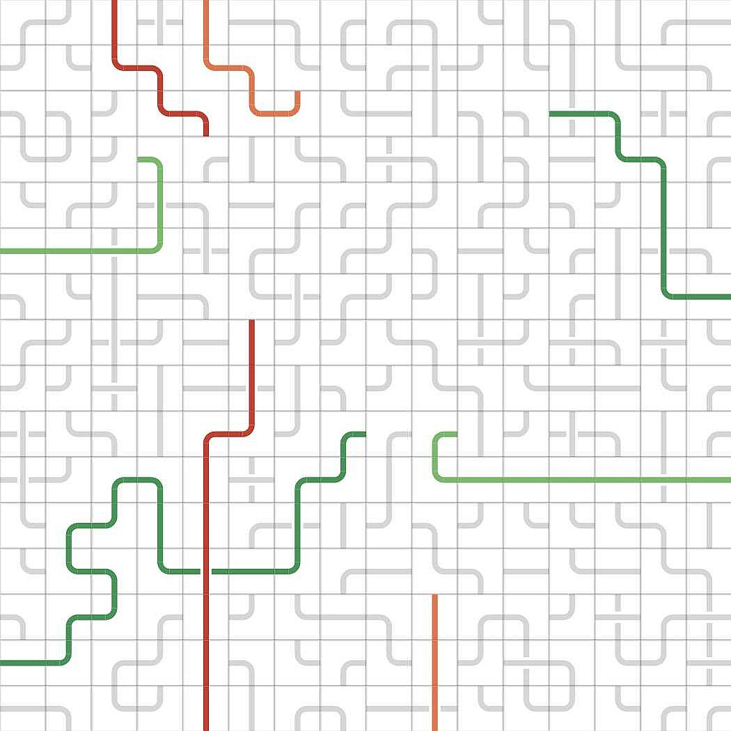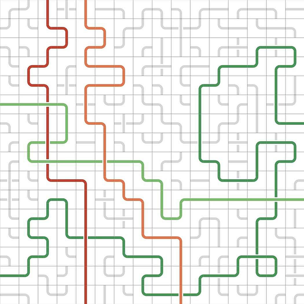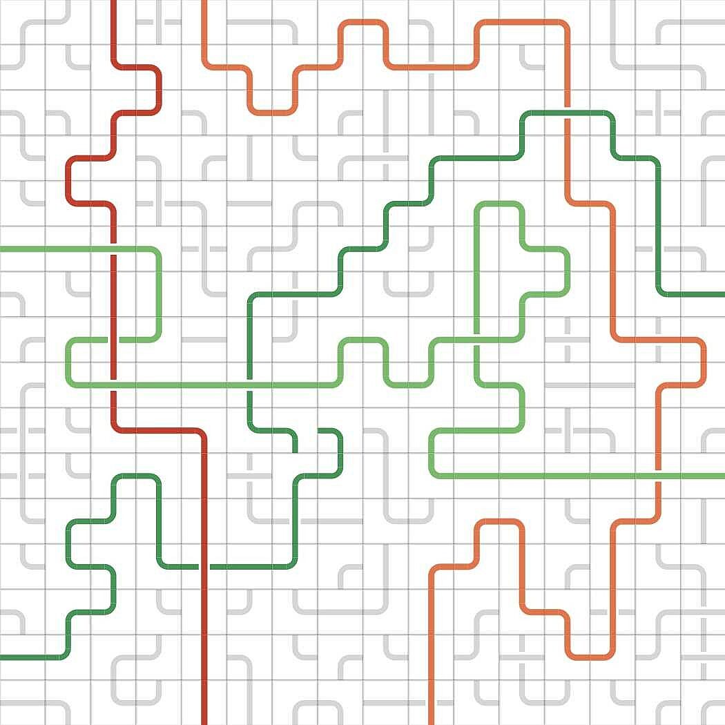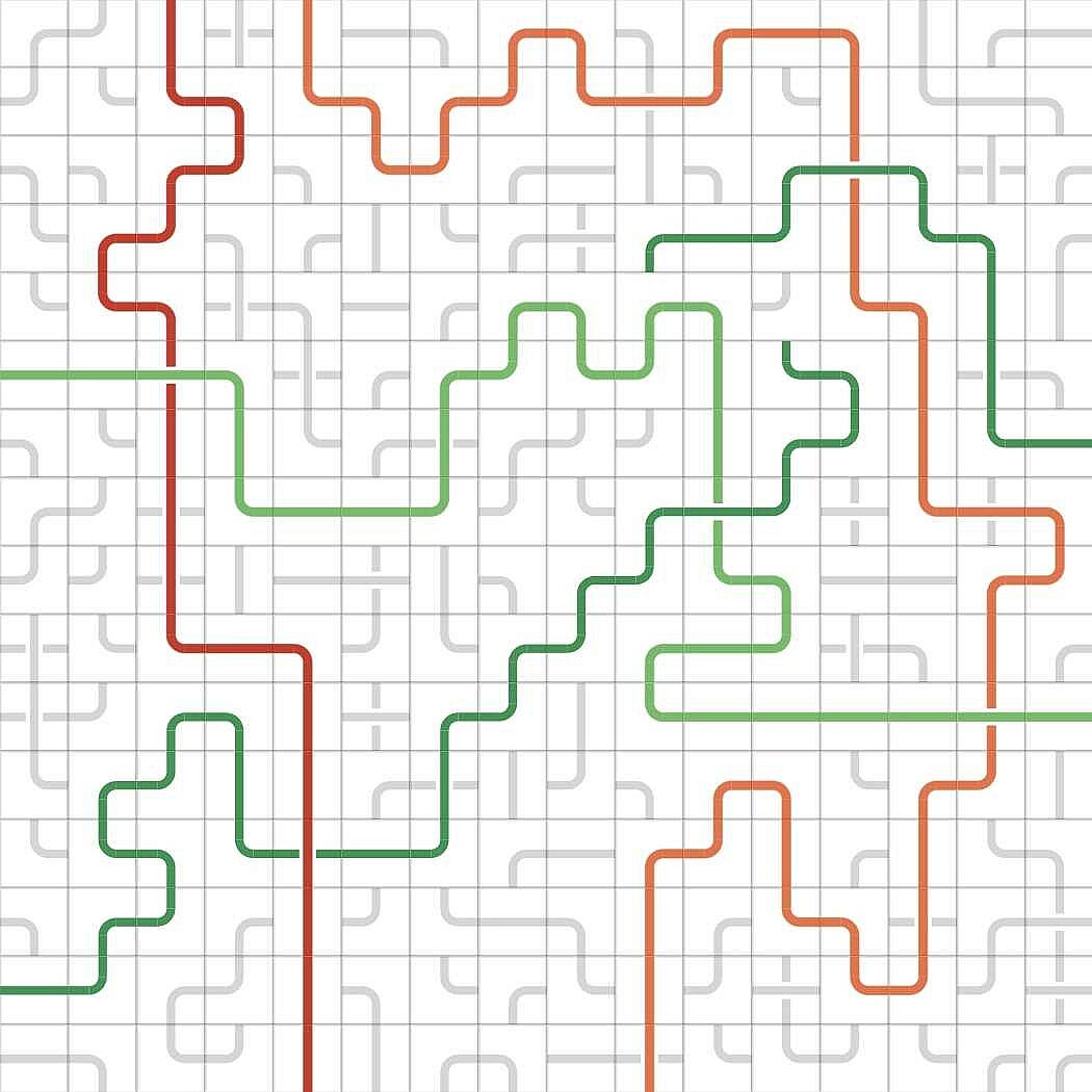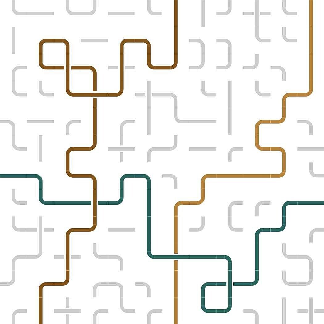 You are challenged to bring order into the jumbled mix of lines and curves by connecting the opposite sides of the same color. Clicking a tile in the grid rotates the lines and curves in it. Colors will follow the lines.