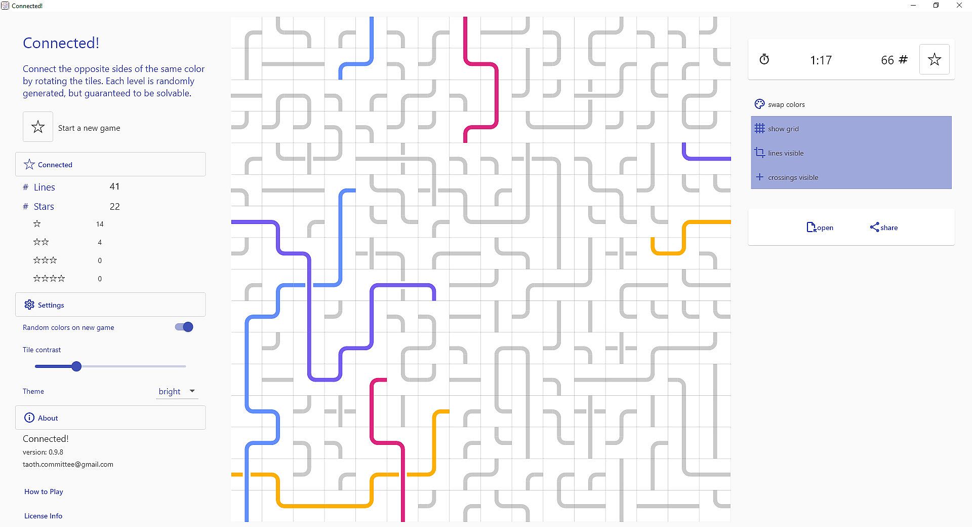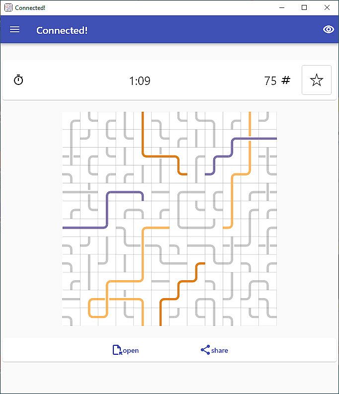 Minimalistic puzzle game. Connect the opposite sides of the same color by rotating the tiles. Each level is randomly generated, but guaranteed to be solvable.