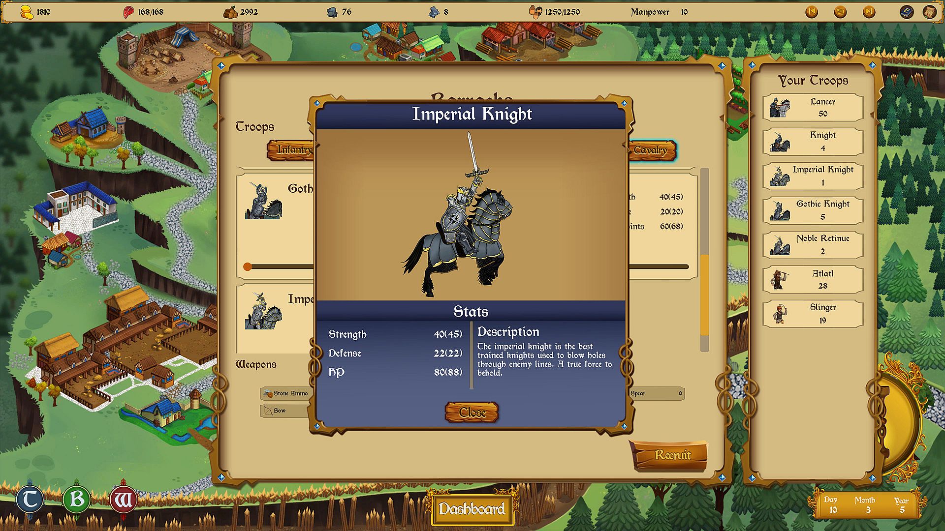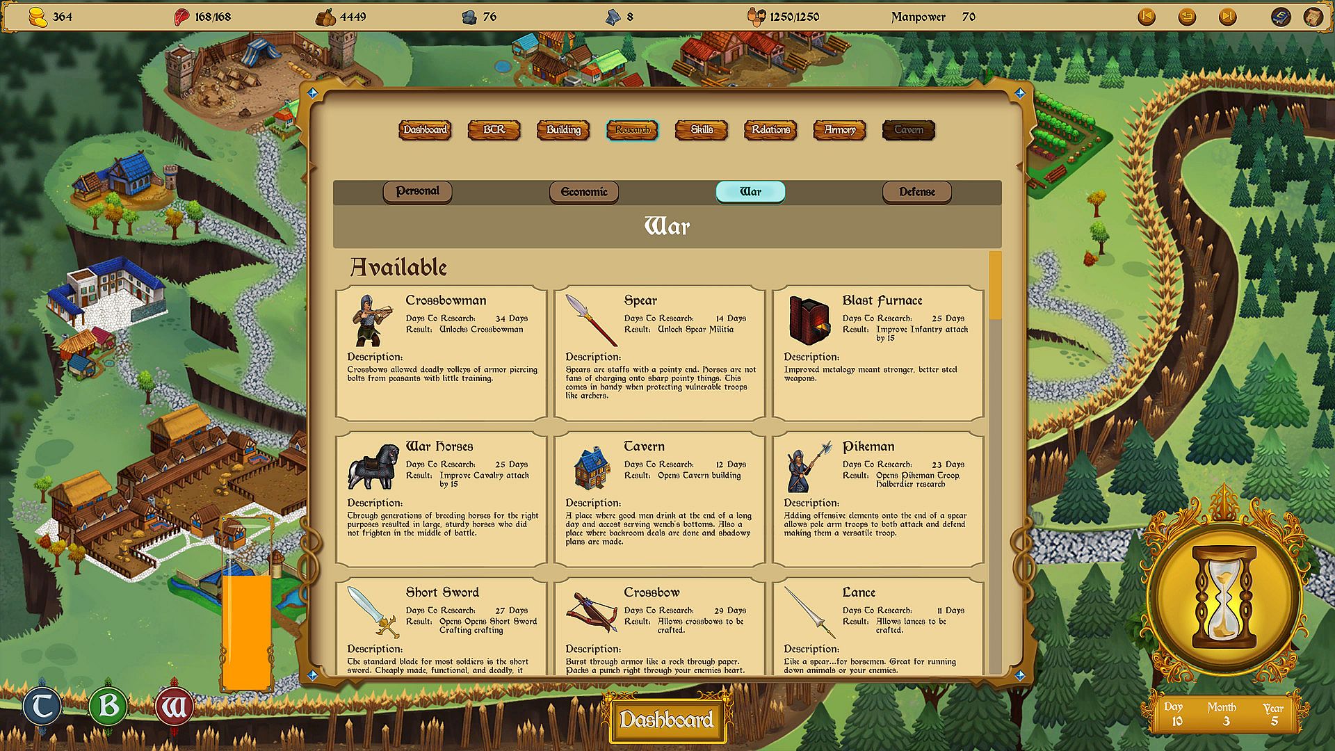 Manage your resources, population, and manpower. Want to go to war and need troops? Recruiting troops comes straight from your population. Population is needed for taxes. Want to trade, research, build, or train? You only have so much manpower! What takes priority is up to you.