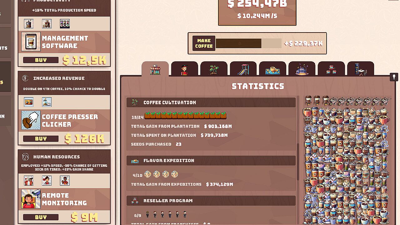 Step into the world of Conradito Cafézito, an incremental and idle game with a coffee theme where every click counts! Manage your café in a colorful 2D pixelated environment, raking in money through automatic coffee production and optimizing every step of your business. Automate tasks, hire employees, improve recipes, and open new branches to speed up your growth and maximize profits.