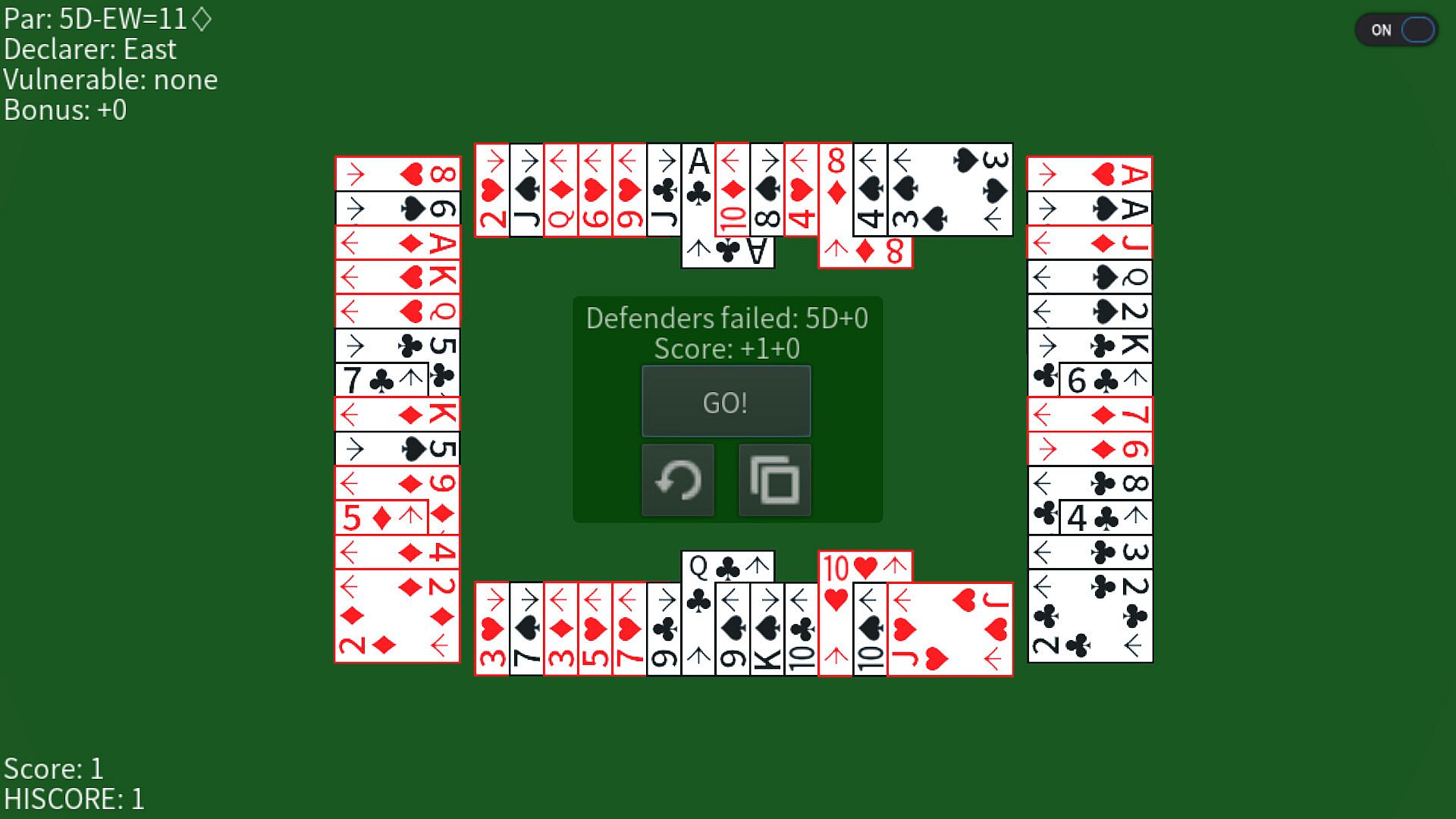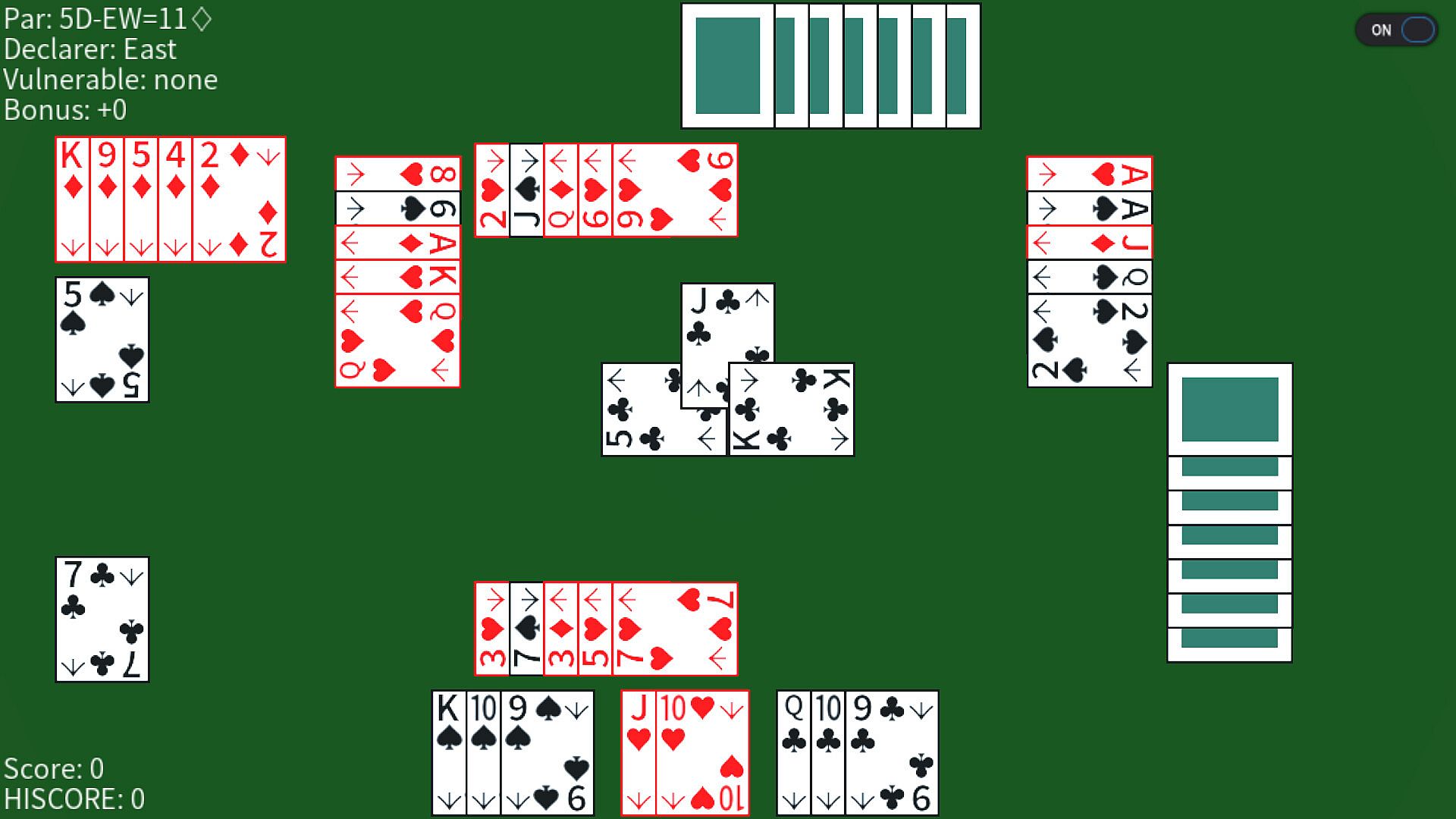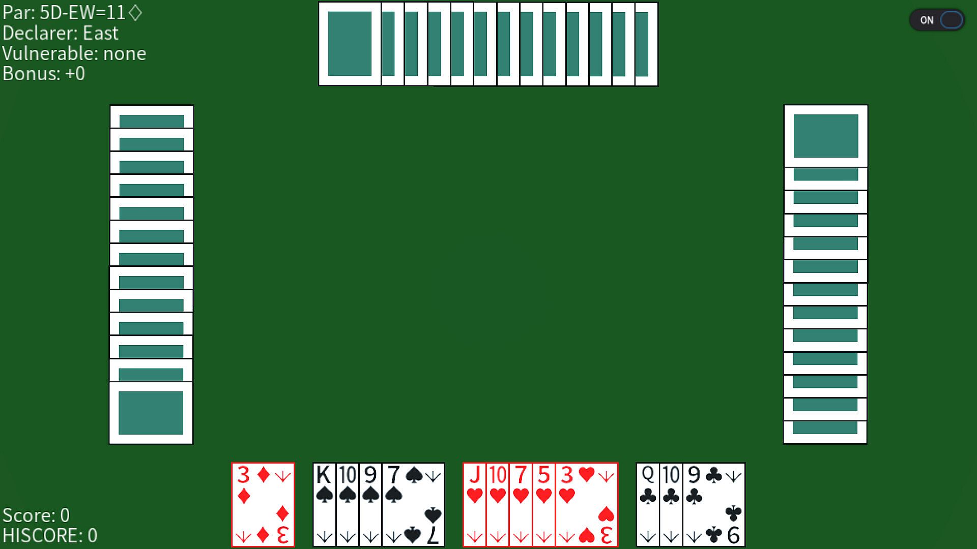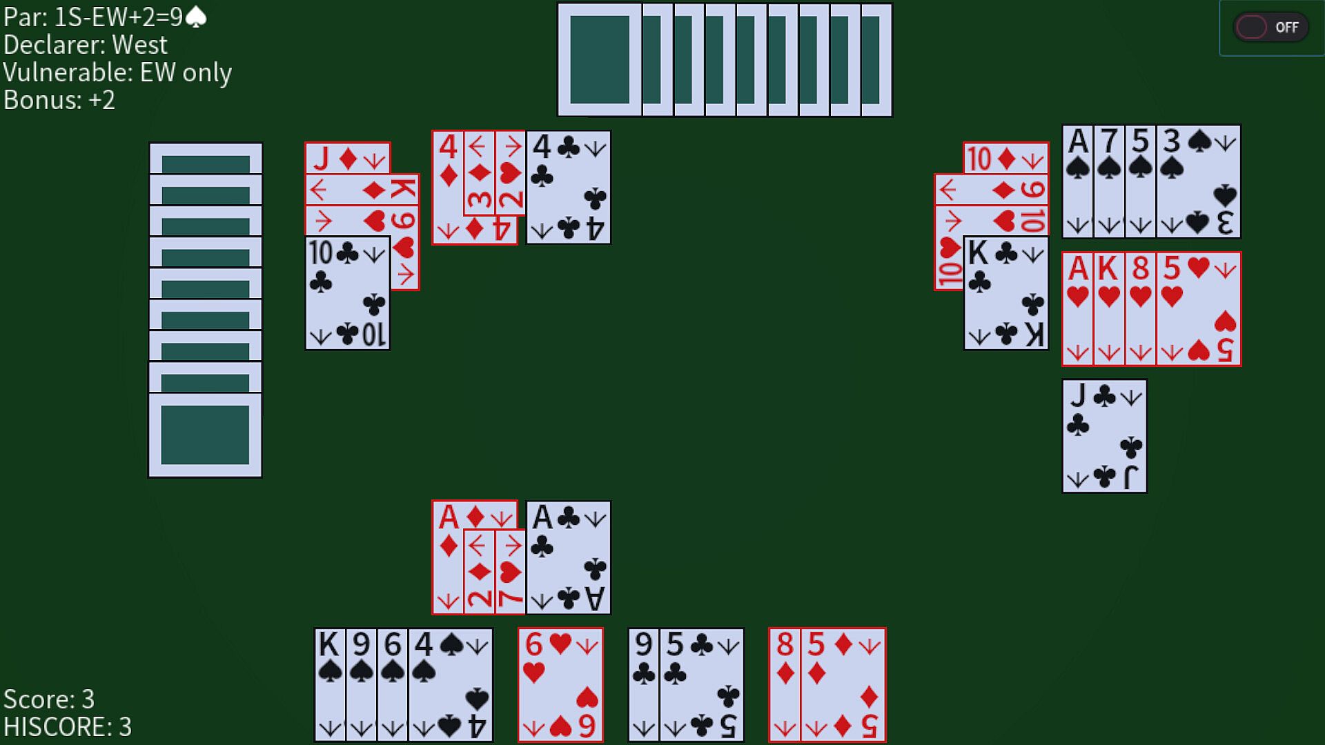 This game is a single-player game based on the contract bridge rules. Without auction/bidding, it automatically determines how many tricks the declarer should win. How many tricks you and your AI partner win together is the key to winning the game. You should have tricks no less than the standard (as the par for the declarer) to get the points. Although you have a very powerful AI partner, it's not easy to play against the other two. If failed, you can try the "play again" feature at the end of the deck to improve your skill.