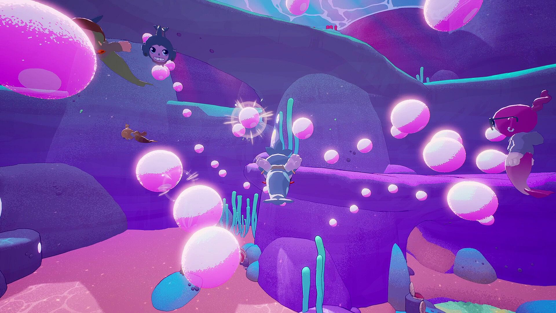 Swim and chill with your friends or meet new ones! Together you'll sing and harmonize to collect fish or goof off and blow the biggest bubbles.