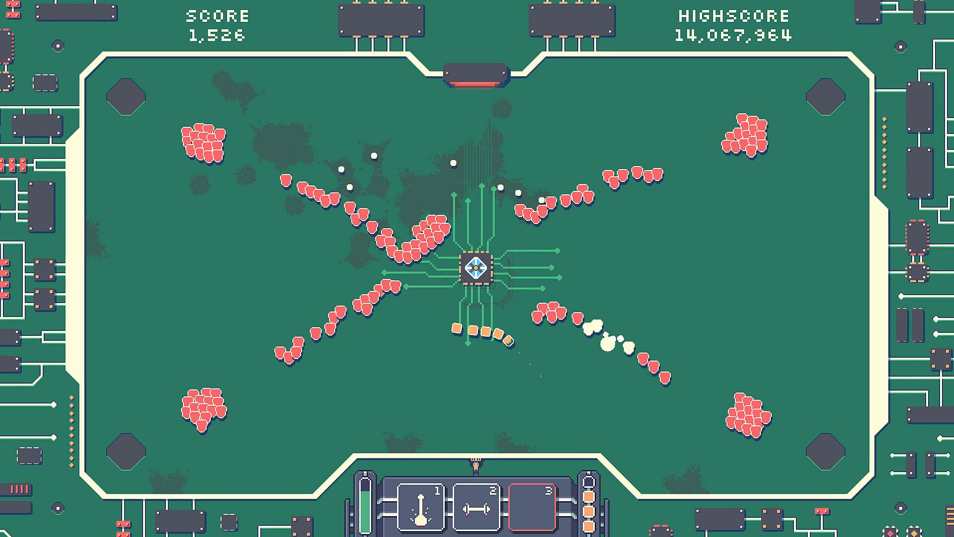 Core Breach is a twin-stick shooter inspired by games like Snake and Geometry Wars, hand drawn in a pixel art style with roguelike elements. You play as a Trojan worm virus infiltrating a CPU core to retrieve the secrets hidden within.