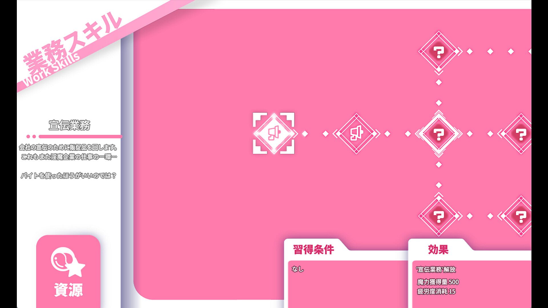 By learning diverse skills and managing her daily schedule wisely, Saki’s available tasks expand gradually, and she can handle more demanding clients.