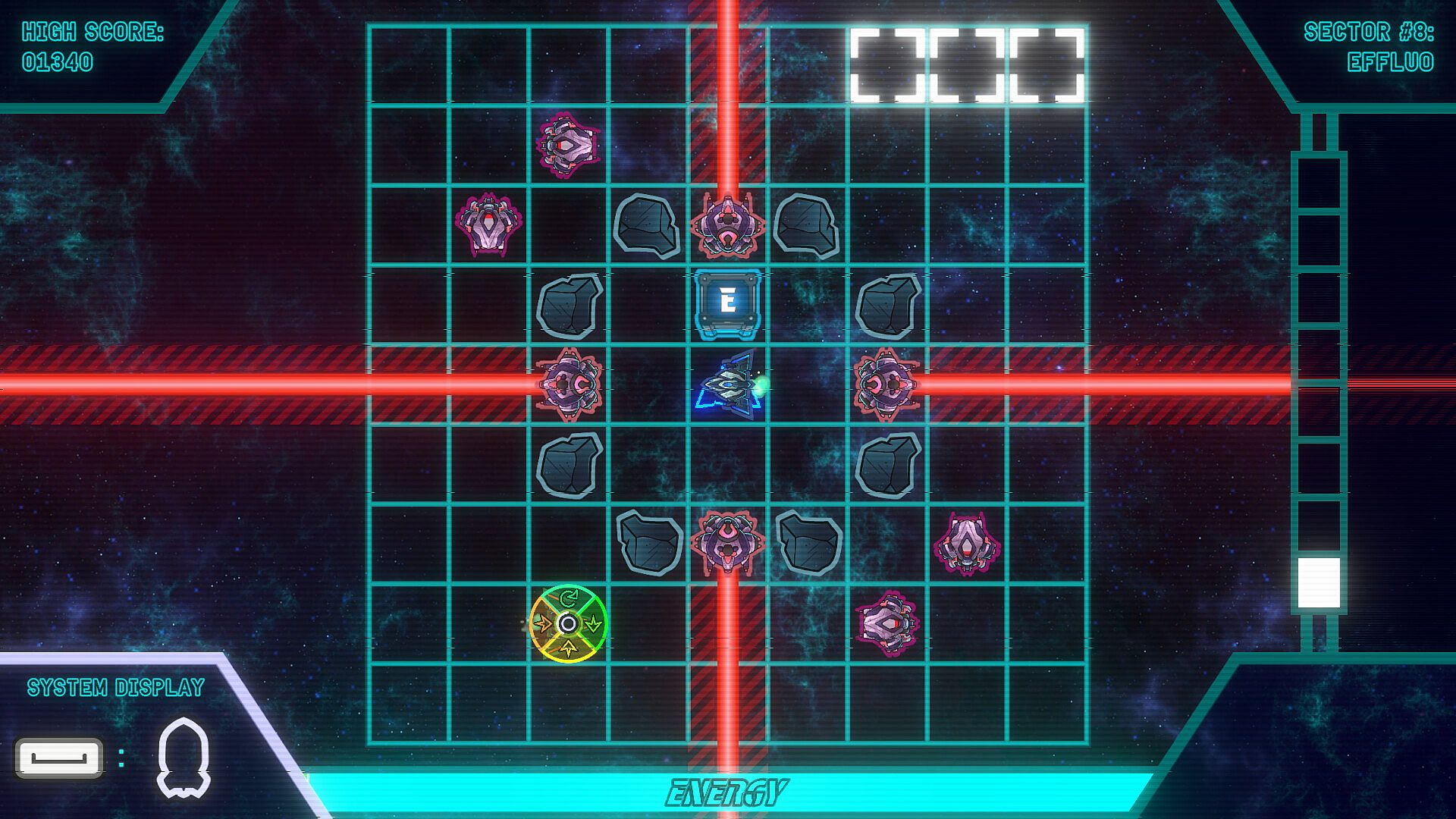 Each level contains multiple grids that you need to complete in order to complete a level. At the end of each grid, you'll regain some energy. If you ever die, time rewinds to allow you to retry the grid, but at the cost of energy.
