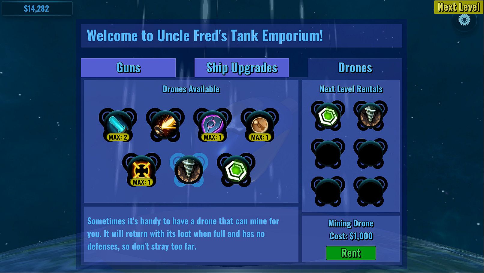 - Upgrade your ship and rent a few helpful drones!