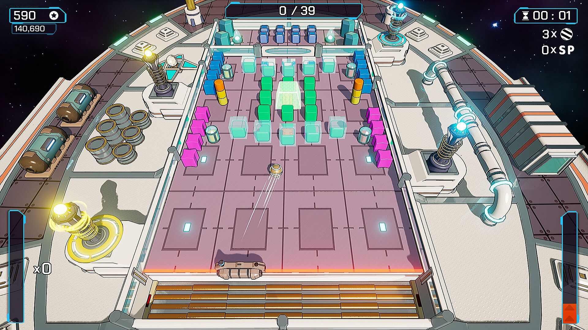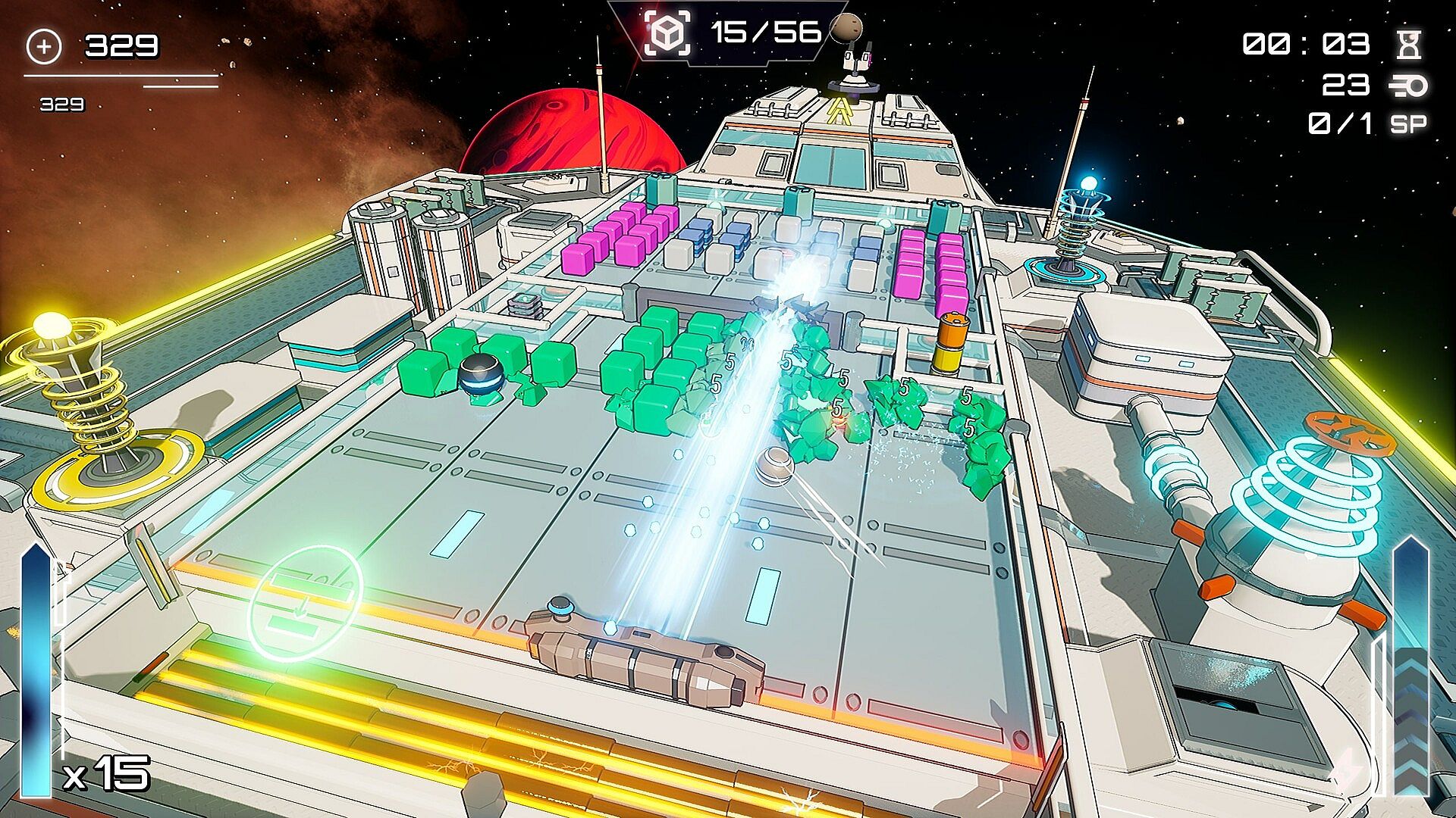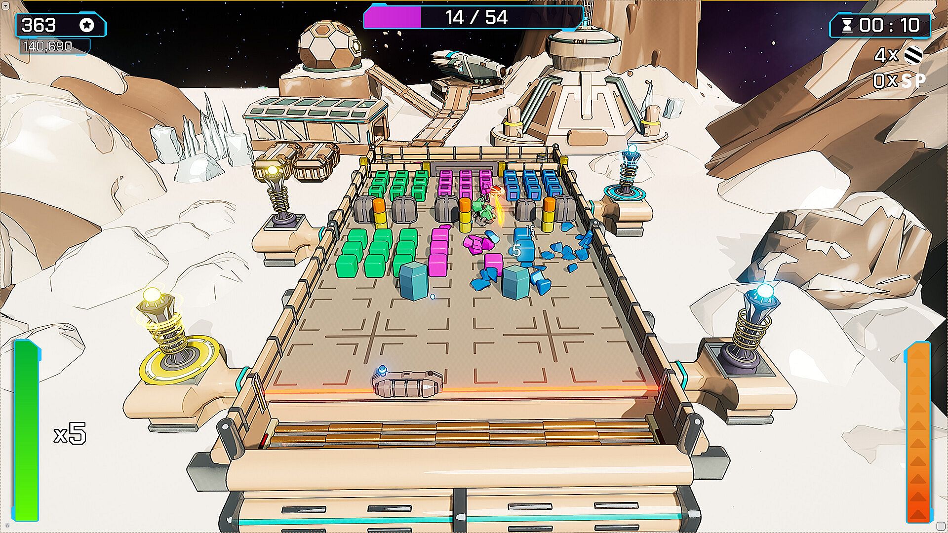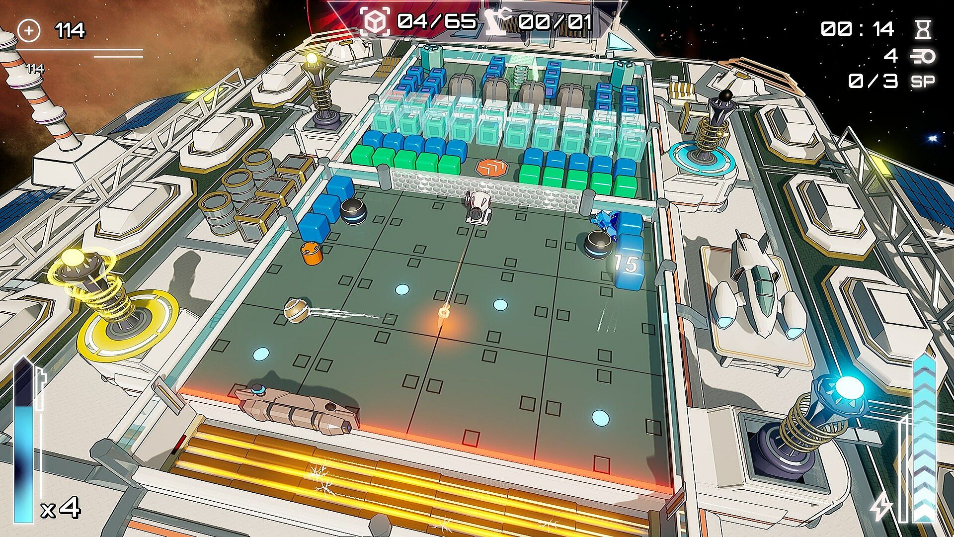 Beyond blocks: Dynamic levels include a variety of different objects – switches, gun turrets, forcefields and more can all be targeted (sometimes with explosive results!)