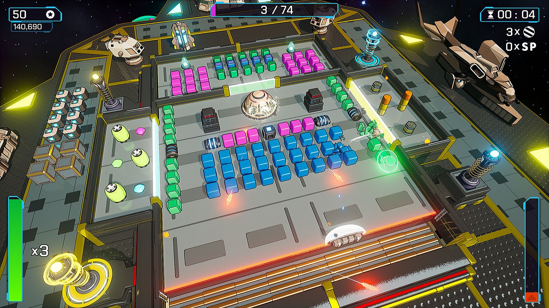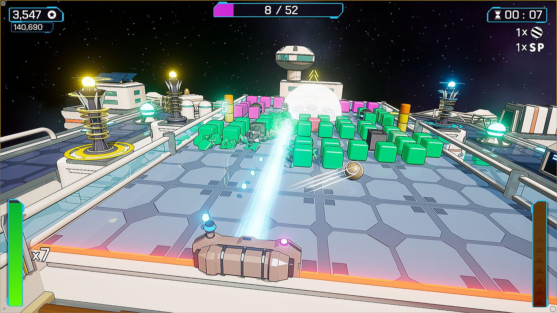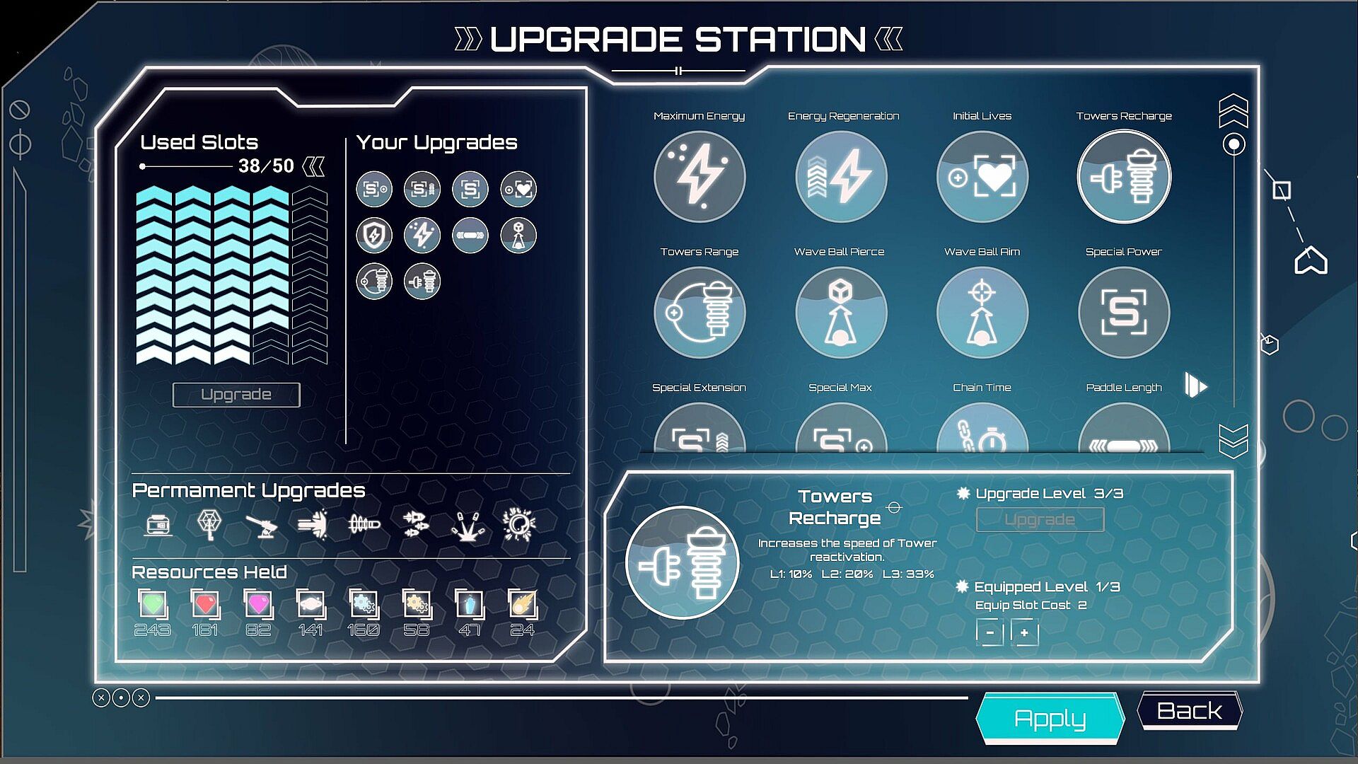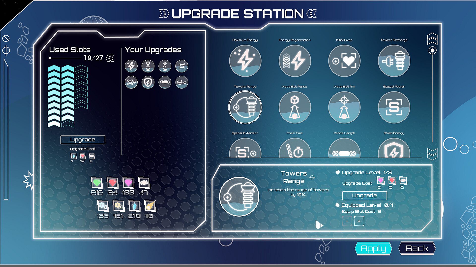 Upgrade Station: Collect resources extracted from broken blocks or destroyed enemies and use them to increase weapon power, tower range, paddle durability and much more