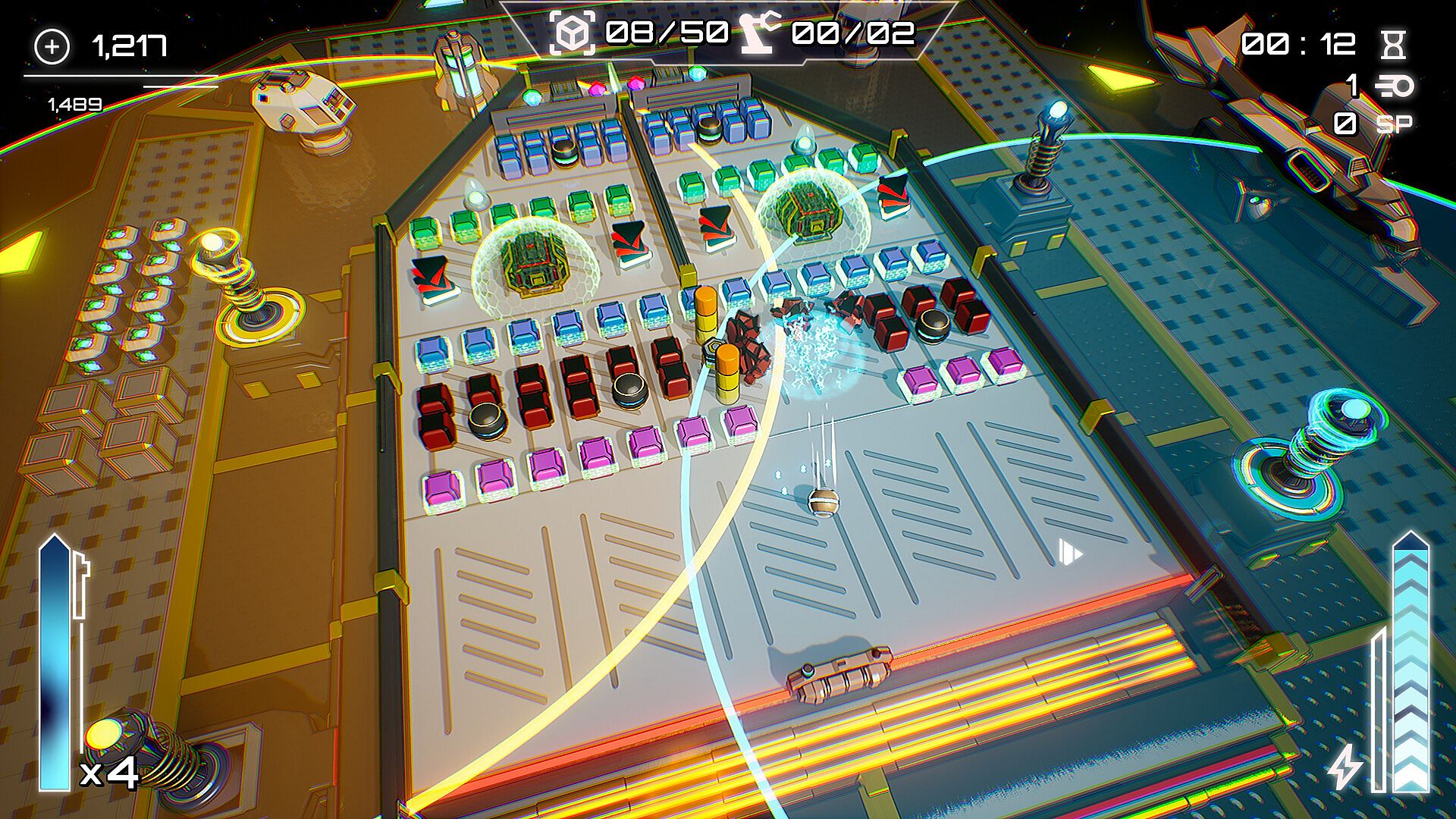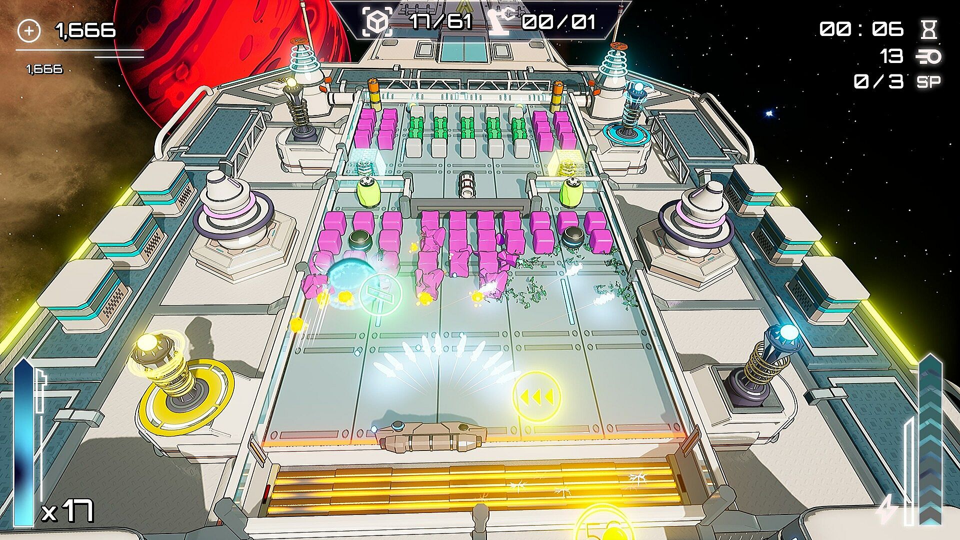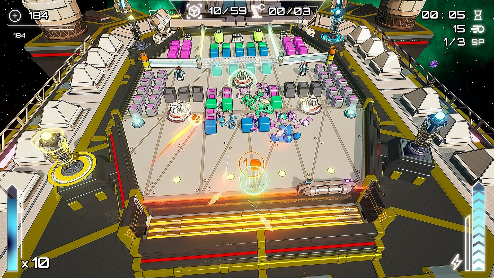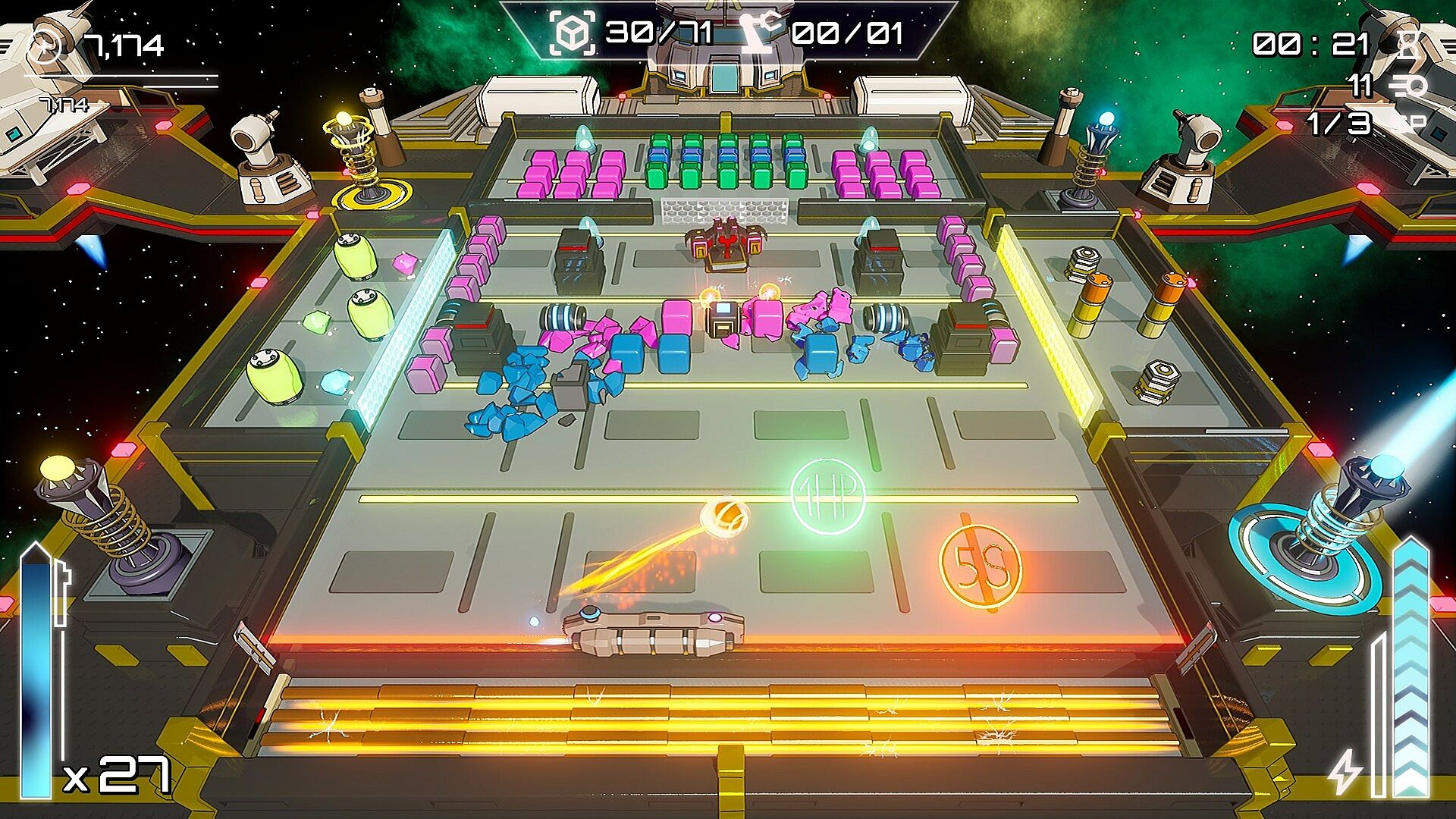 Upgrade Station: Collect resources extracted from broken blocks or destroyed enemies and use them to increase weapon power, tower range, paddle durability and much more