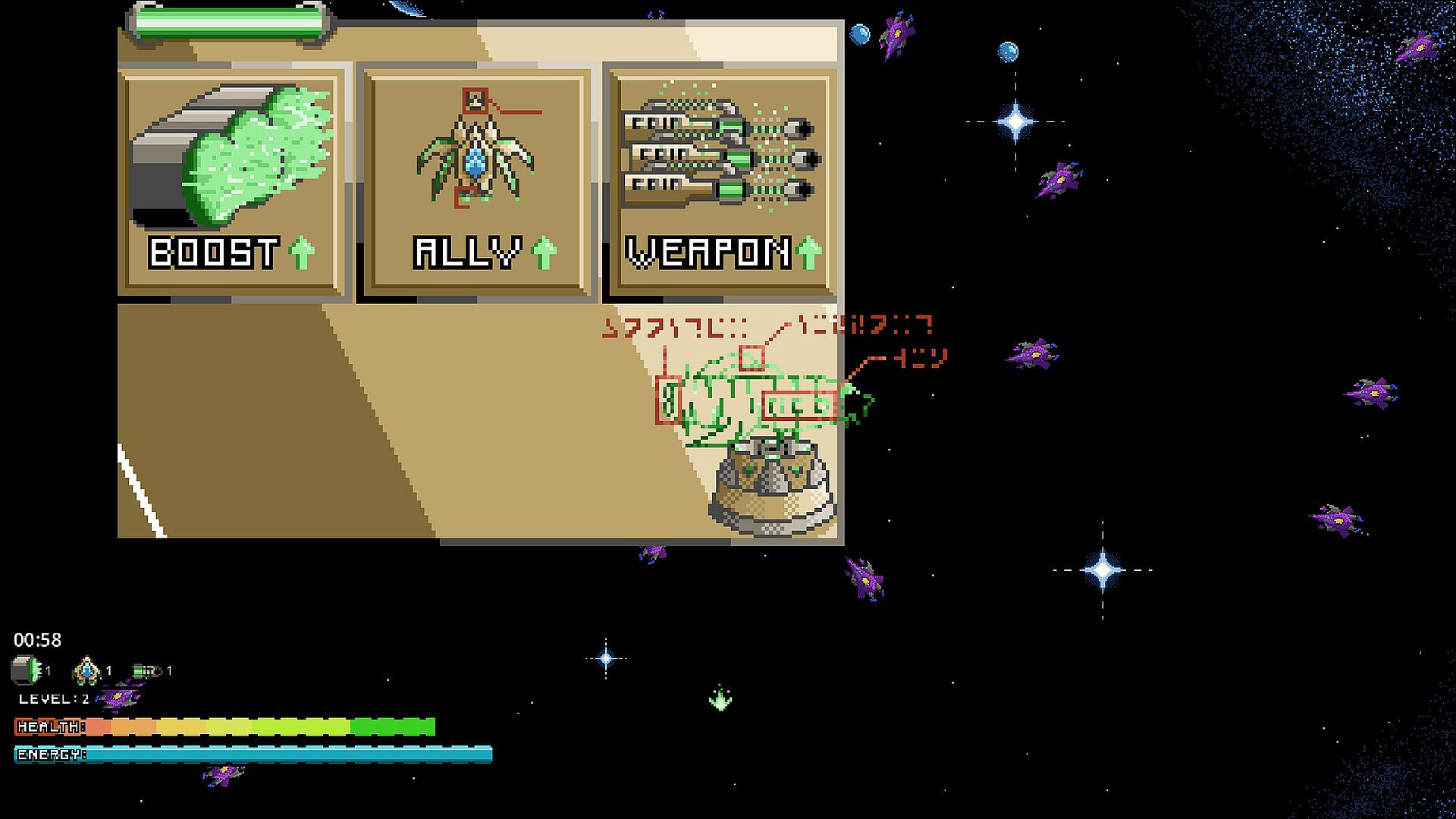 In Cosmolon, you can level up your booster and stats, your primary weapons, and even have extra fighter ships as support. Leveling up requires earning experience, which means destroying ships and collecting the orbs they drop.