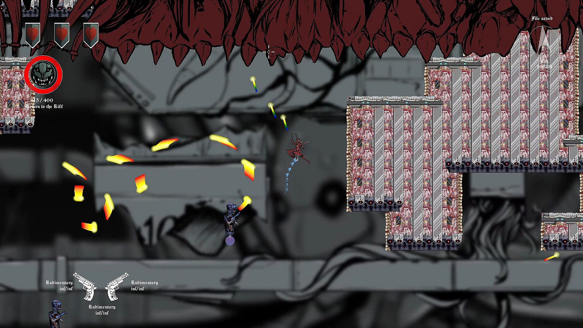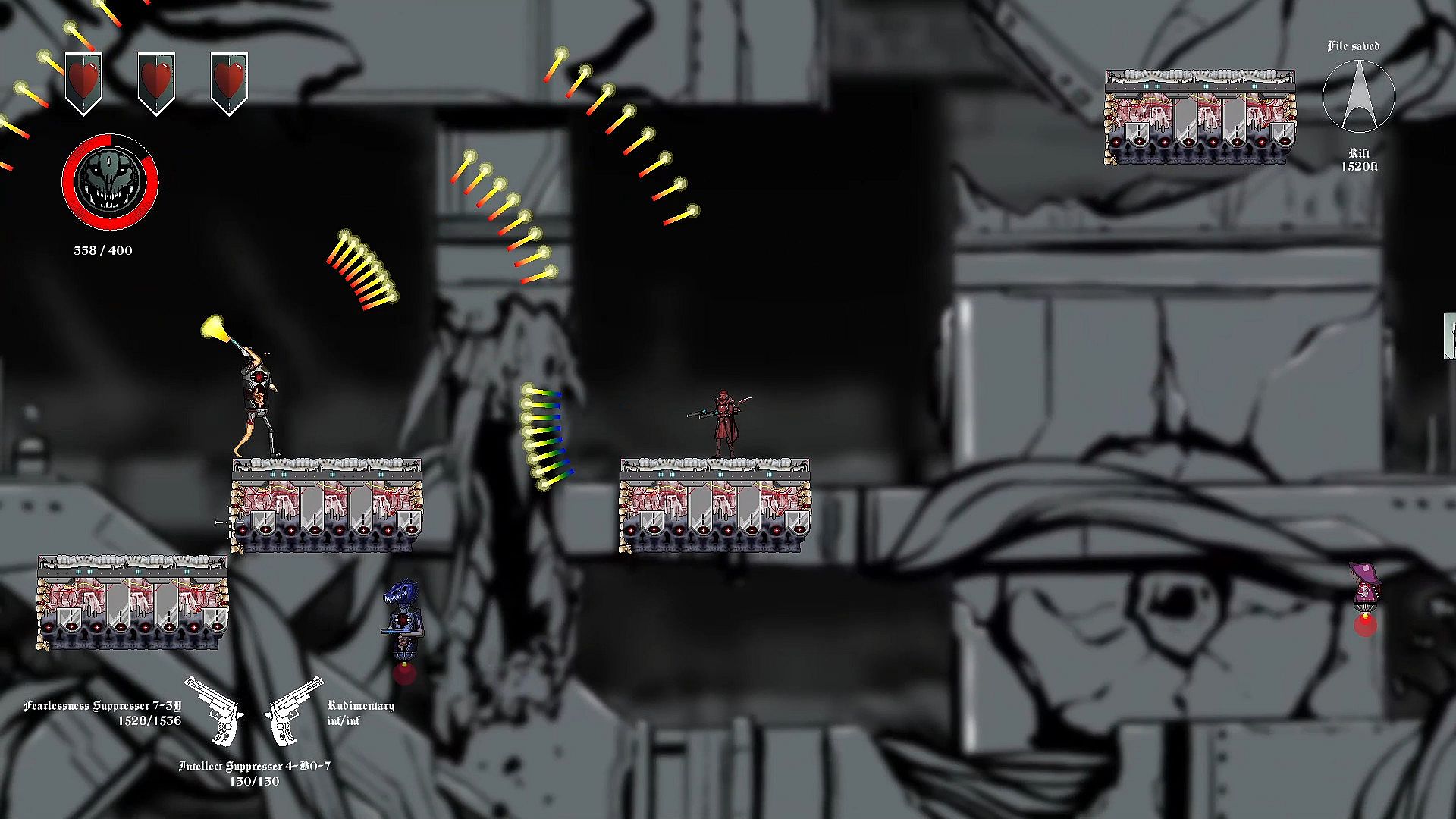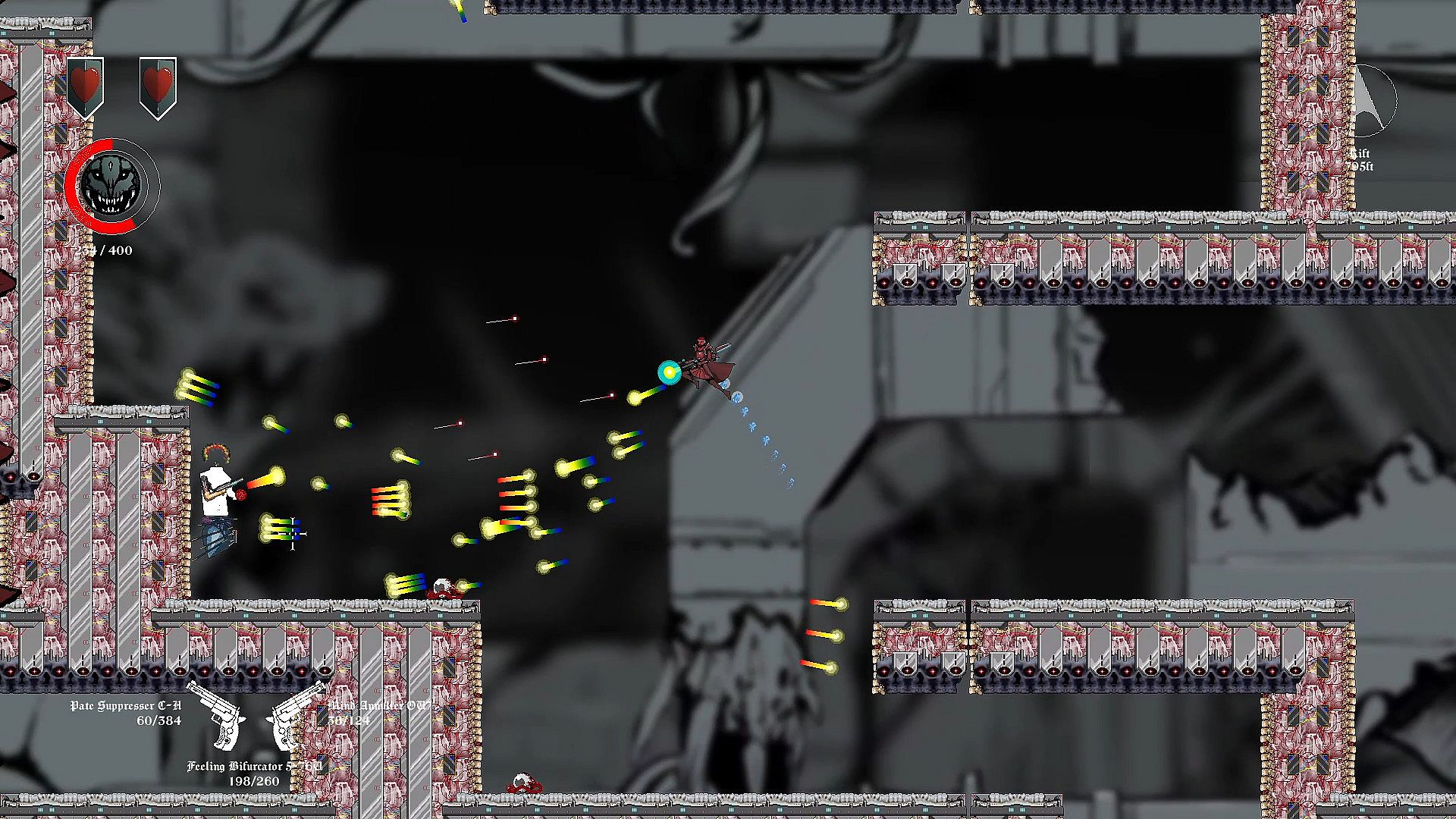 - Precision platforming and bullet hell gameplay combine for a difficult but rewarding play experience.