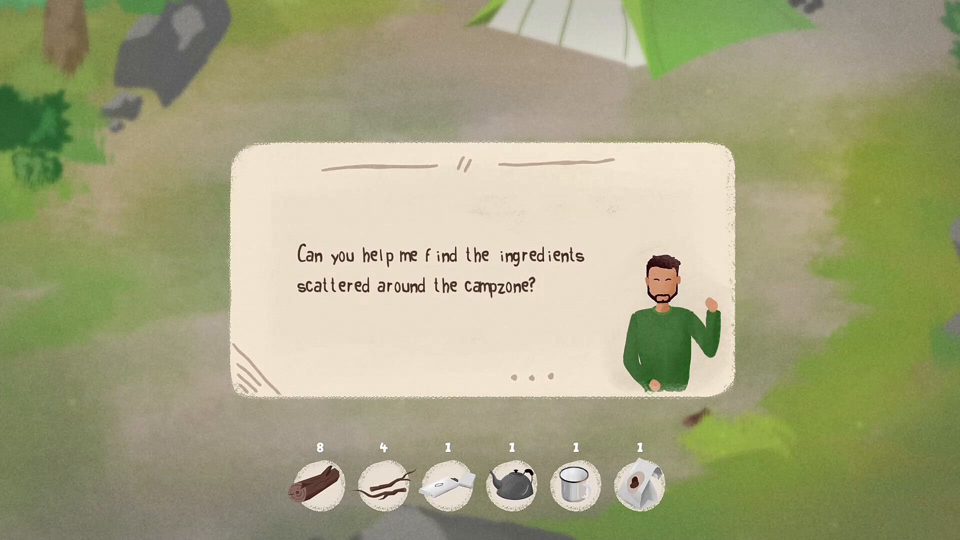 A game about searching in the fields around a camp, to find the ingredients and make a delightful coffee recipe.