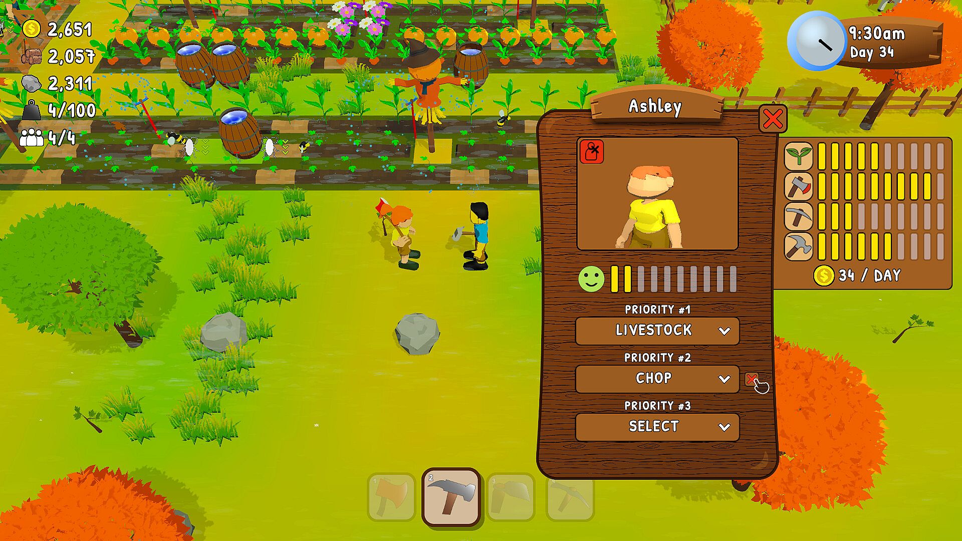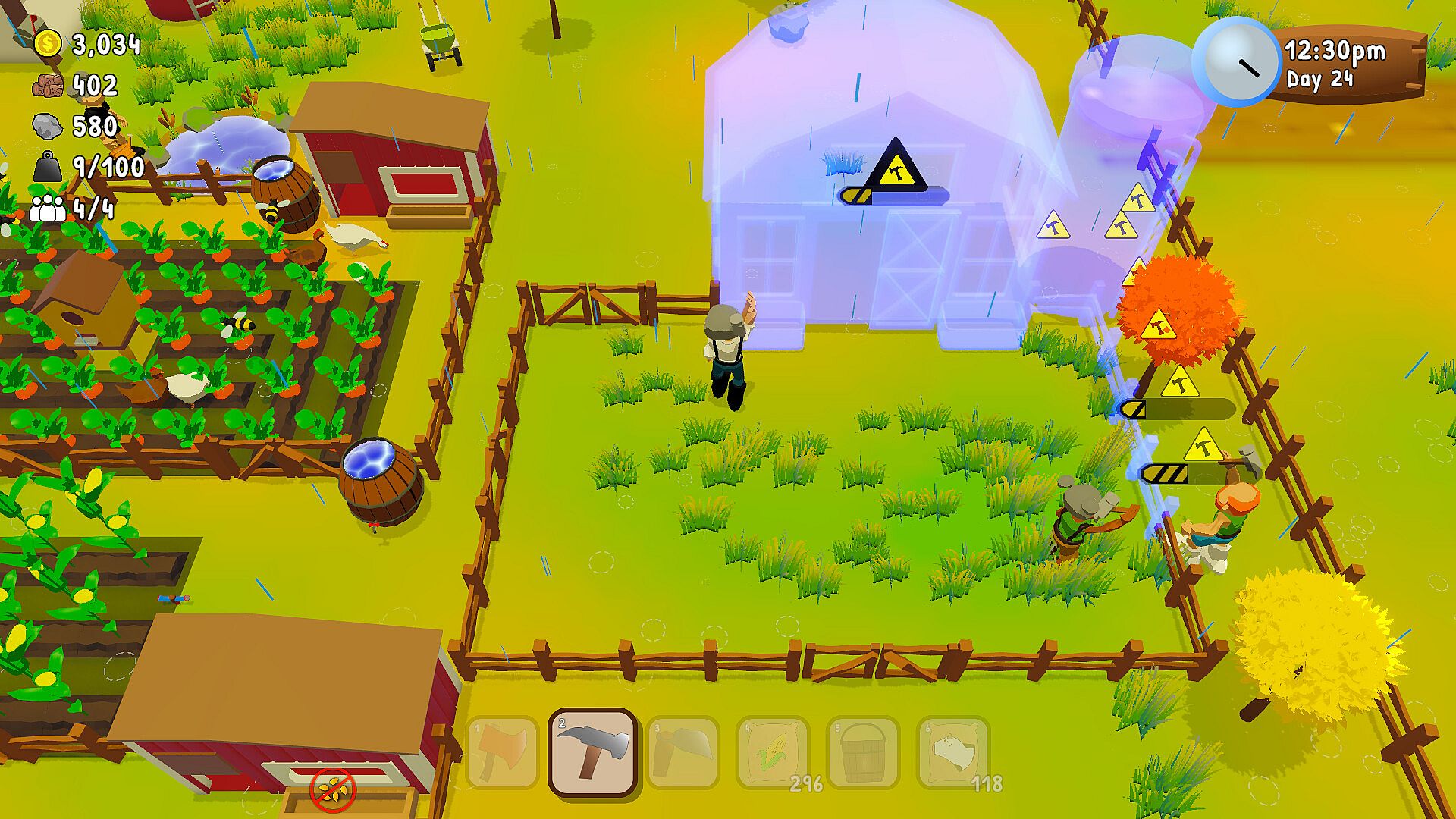 Assign jobs to your farmhands: Let them handle basic tasks around the farm like watering, harvesting, building, mining, chopping, and caring for livestock!