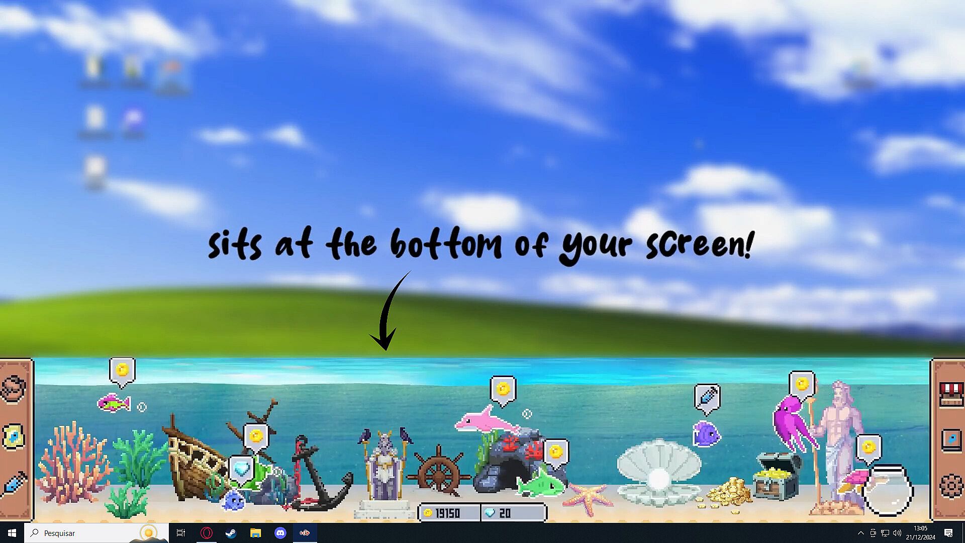 is a relaxing game that sits at the bottom of your screen, fitting perfectly into your daily routine, whether you're working, studying, or having fun with other tasks. Have your own aquarium always available at the bottom of your screen. Take care of it at your own pace, no rush, no worries, and enjoy the company of your new little fish.