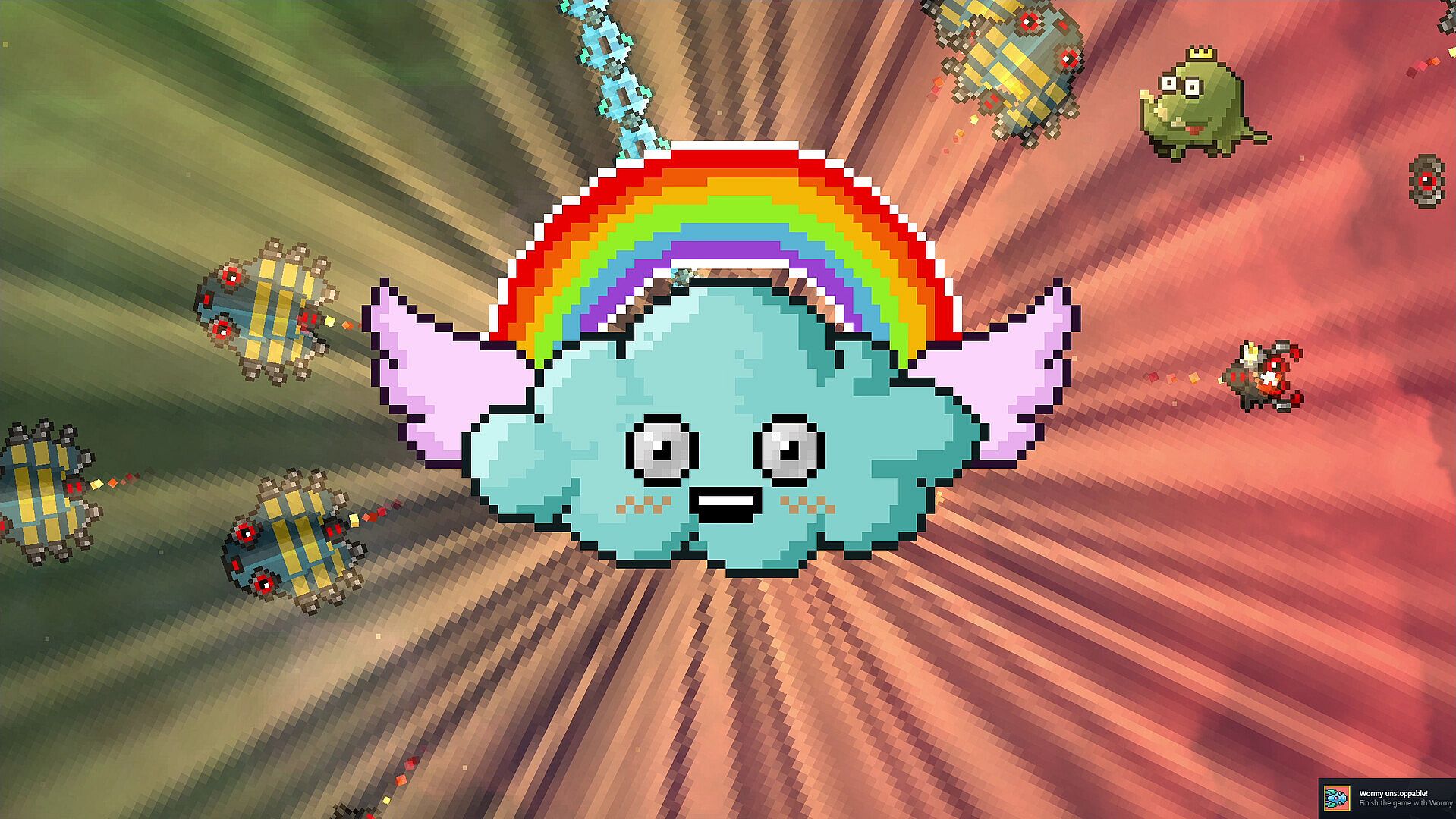 Explore a colorful, tiny universe. Help its cute inhabitants solve their problems. Use satisfying weapons to defend you and your new friends against hordes of quirky enemies. You can focus on controlling your shipy while shooting happens automatically. There are unique landmarks to discover, and enemies leave experience points for level-ups to gain new skills. In addition, you can mine chocolate asteroids to unlock permanent upgrades.