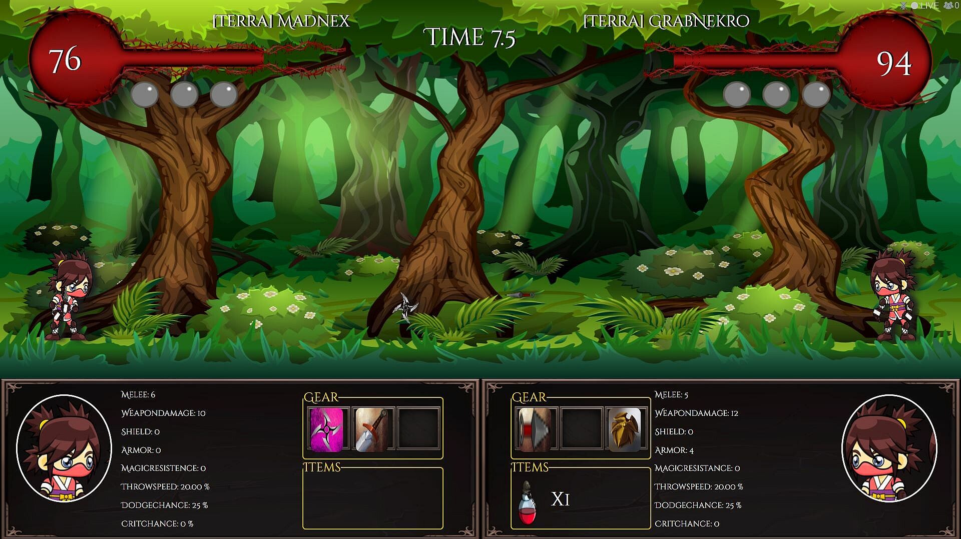 Do you know rock-paper-scissors? But what if the scissors is a ninja that suddenly summons lightning? That is the principle of this game. 2 players choose a character and equip it with artefacts, attributes and weapons and let them fight each other automatically.