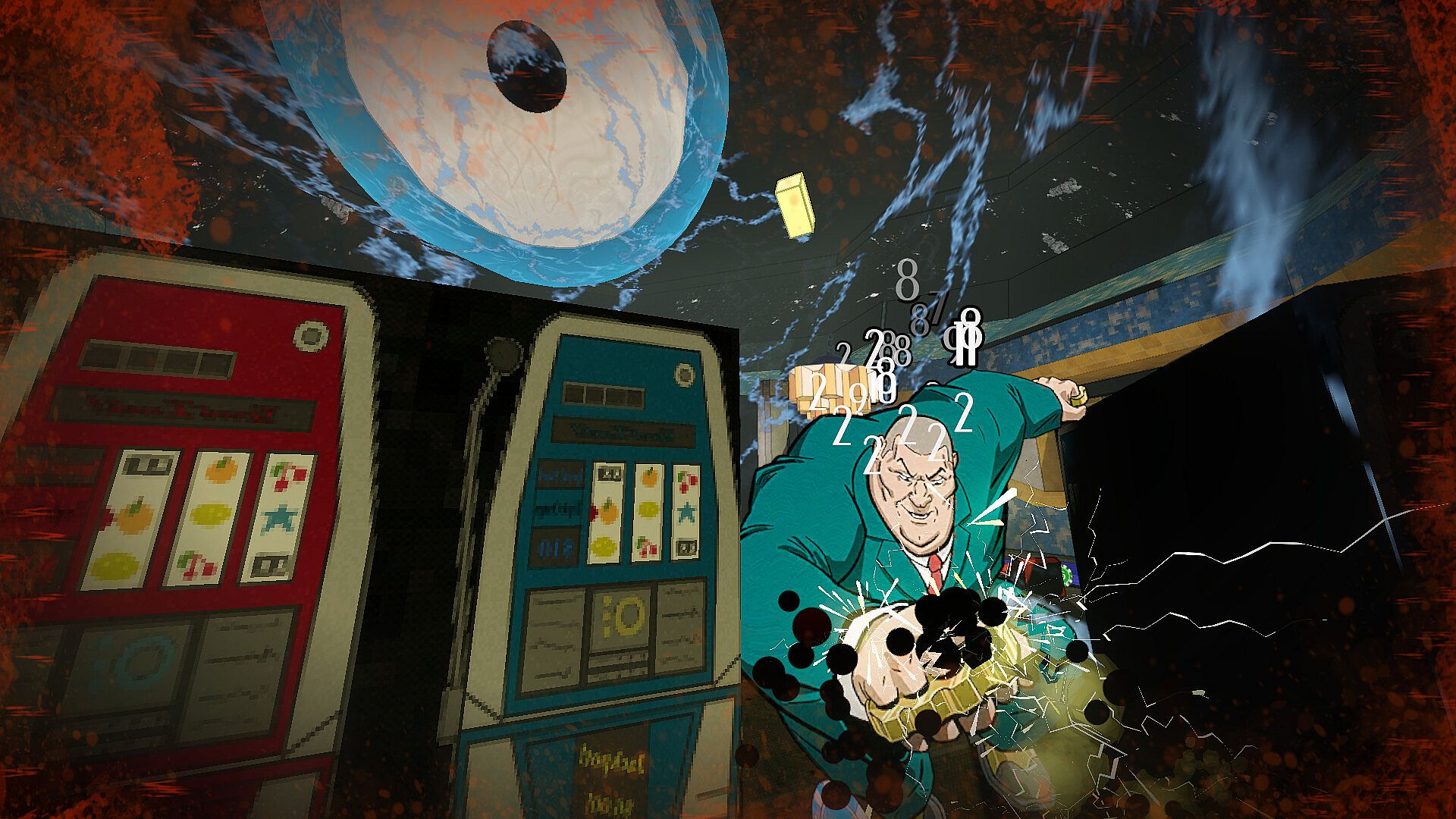 Armed with a strange weapon, The Rake, slot machine rollers click into place, each result totally changing how the gun works.