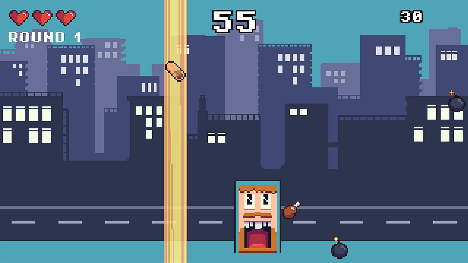 Watch out: Bombs slash your score in half. Grab upgrades to slow bombs, double points, or even eat explosives.